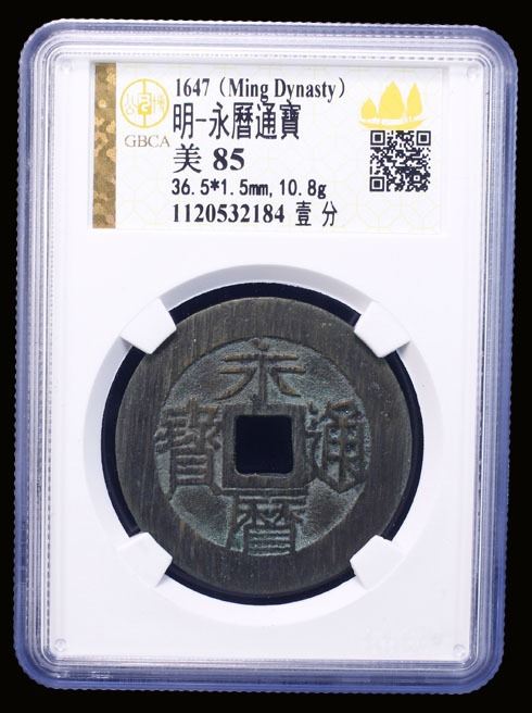 NAN MING: Yong Li, 1646-1659, AE 10 cash (10.8g), H-21.79, small flan, yi fen (one fen [of silver]) on reverse, graded 85 by GBCA Grading Company, VF-XF.