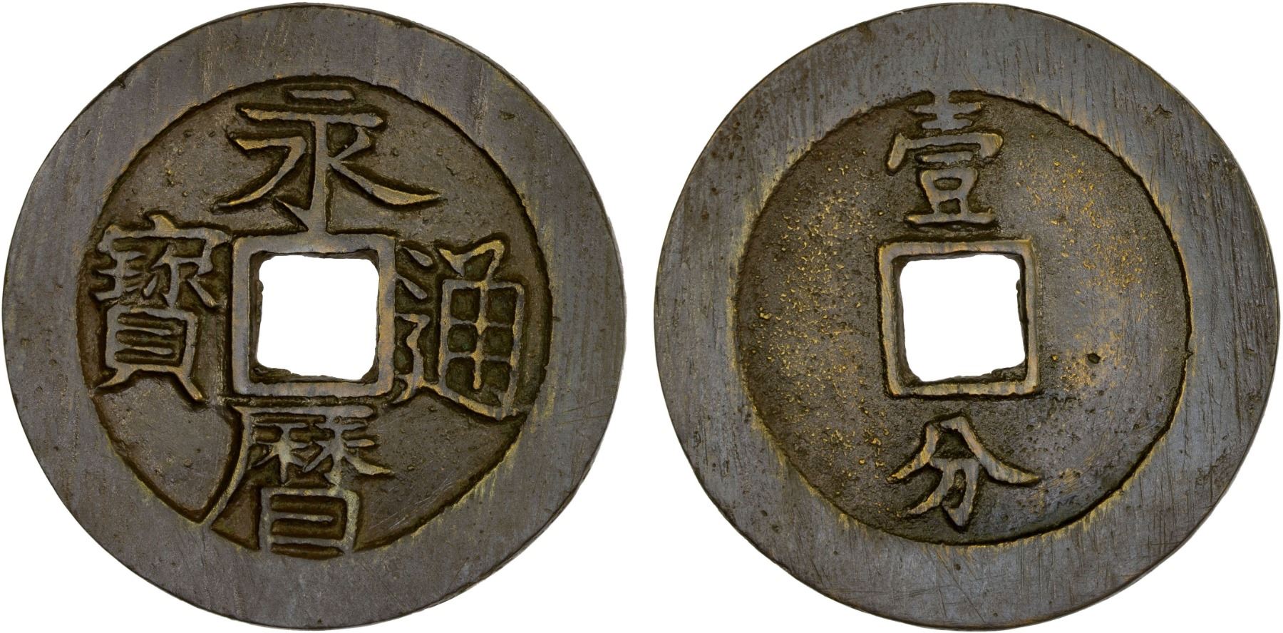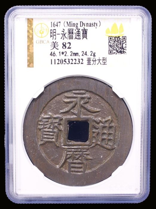 NAN MING: Yong Li, 1646-1659, AE 10 cash (24.2g), H-21.78, 46mm, large flan, yi fen (one fen [of silver]) on reverse, narrow yi variety, graded 82 by GBCA Grading Company, VF.