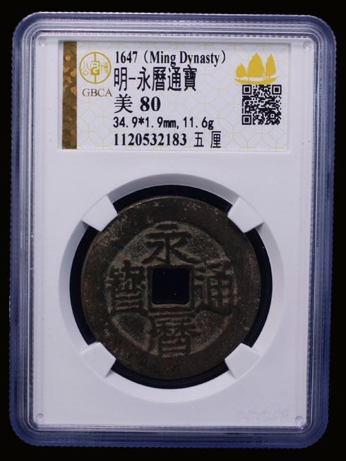 NAN MING: Yong Li, 1646-1659, AE 5 cash (11.6g), H-21.74, wu li on reverse, graded 80 by GBCA Grading Company, VF.