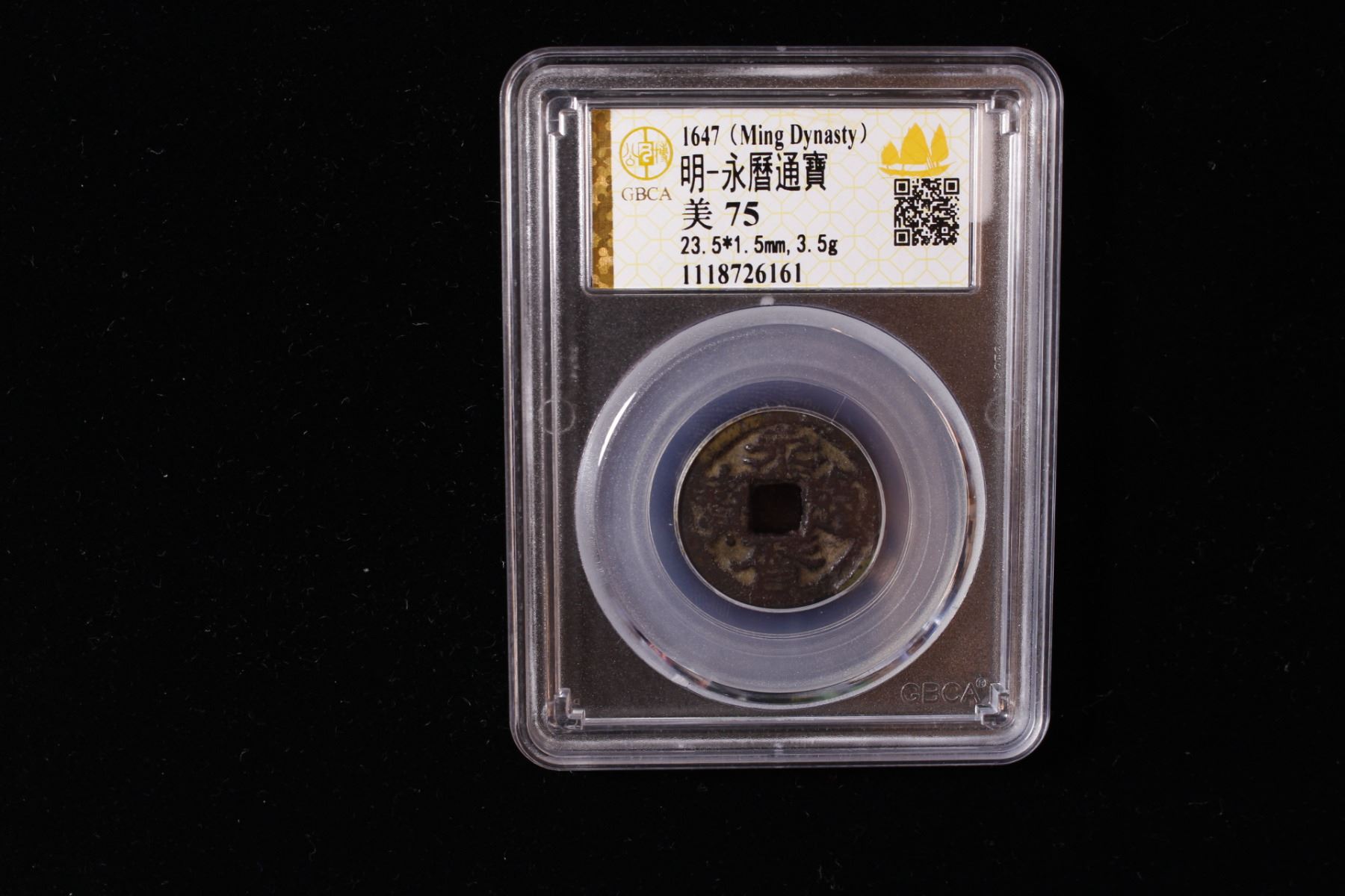 NAN MING: Yong Li, 1646-1659, AE cash (3.5g), H-21.61, du above on reverse, graded 75 by GBCA Grading Company, Fine, ex Dr. Dirk Löer Collection, ex Dr. Wittenberg Collection. Part of the "Chi Hua qian" (Imperial Message coins) series which it is said can be arranged to form a message. The message is traditionally given as: yu chi du bu dao [fu] liu yue ming ding guo, "Imperial Orders, the governor-generals, Daotais, [and the Prefects] are to guard Yue [Guangdong and Guangxi] and Assist Ming to Settle the State". The differences in the writing of Yong and Tong suggest that these coins were the product of more than one mint. In 1651, it is recorded that the casting of the Zunyi mint in Guizhou was changed from Xingchao coins to Yongli coins for Prince Yongming. Square head tong coins of the San Fan Rebellion can be ascribed to the Guizhou mint, and others to the Yunnan mint by virtue of the gui and yun characters on the reverse. Presumably square head tong Imperial Message coins were also cast in Guizhou. Other proposed readings of the "message" are even more forced, and it is very likely that in reality there is no hidden message in these characters, and that they were picked at random for use as privy marks.