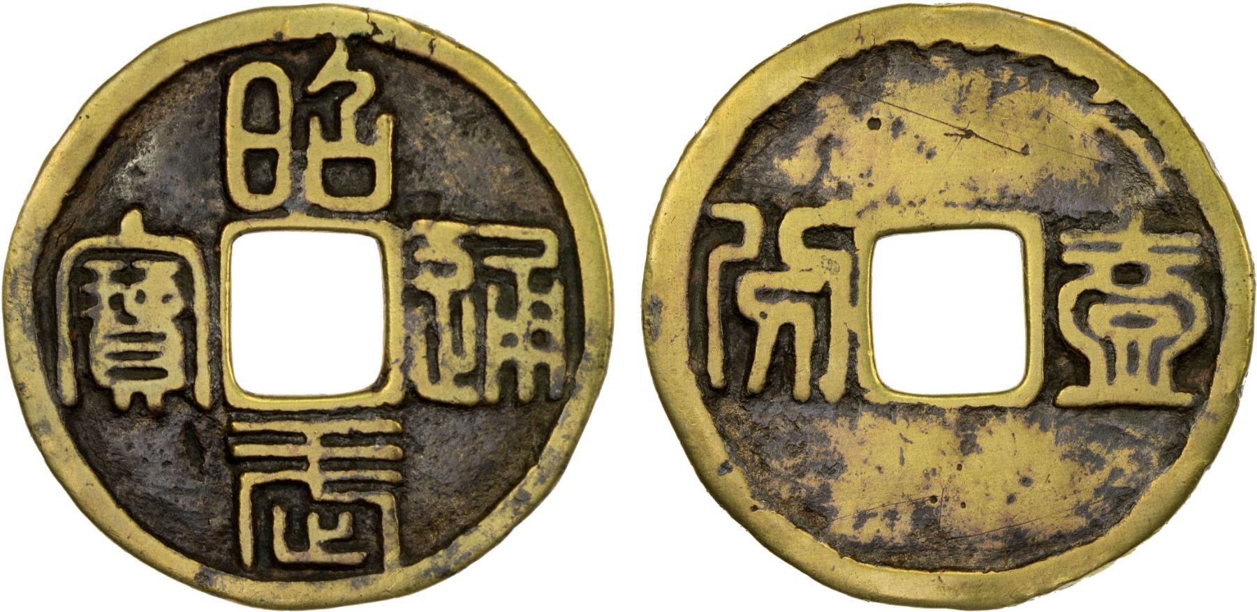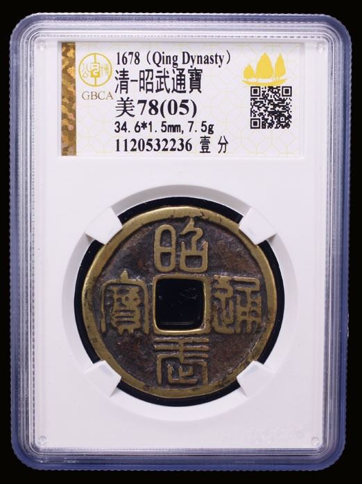 NAN MING: Zhao Wu, 1678, AE 10 cash (7.5g), H-21.111, seal script, yi fen (one fen [of silver]) on reverse, graded 78(05) by GBCA Grading Company, natural flan crack, Fine. In 1678, Wu Sangui declared himself the emperor of the "Great Zhou Dynasty", with the era name of Zhaowu. He established his capital at Hengzhou (present-day Hengyang, Hunan). When he died in October 1678, his grandson, Wu Shifan, took over command of his forces and continued the struggle until he was defeated soon after, in December 1681.