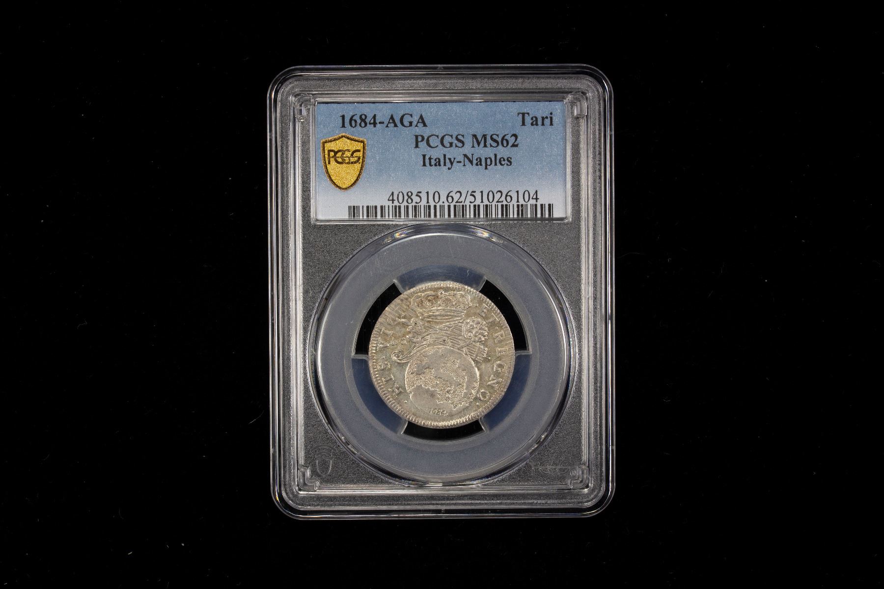 NAPLES: Carlo II, 1674-1700, AR tari, 1684, KM-104, an attractive example, PCGS graded MS62, ex Dr. Robert A. Rosenfeld Collection, ex Coin Galleries Auction, July 18, 1990, Lot 1395 with original auction ticket.