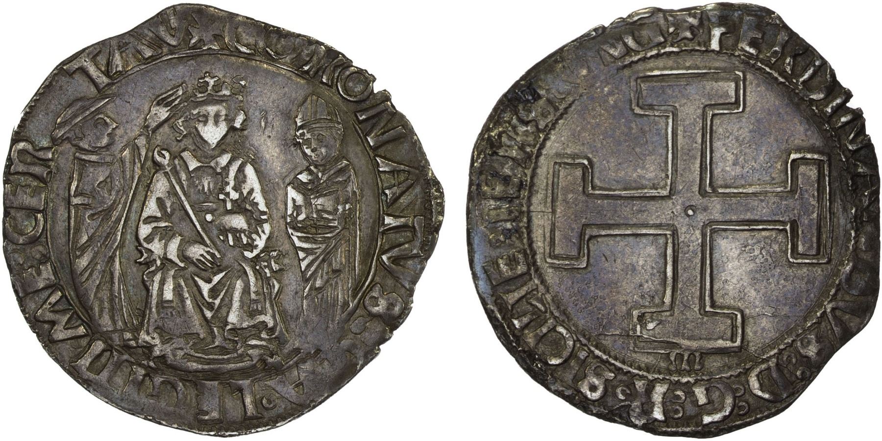 NAPLES: Ferdinando I d'Aragona, 1458-1494, AR coronato (3.82g), ND, MIR-66/1, central cross with no crosshatching within inner circle with +FERDINANDVS D G R SICILIE IERS VNG around // King enthroned facing with attendants at sides with +CORONATVS qA LEGITIME CER - TA V around, very slight obverse oxidation, VF-XF.