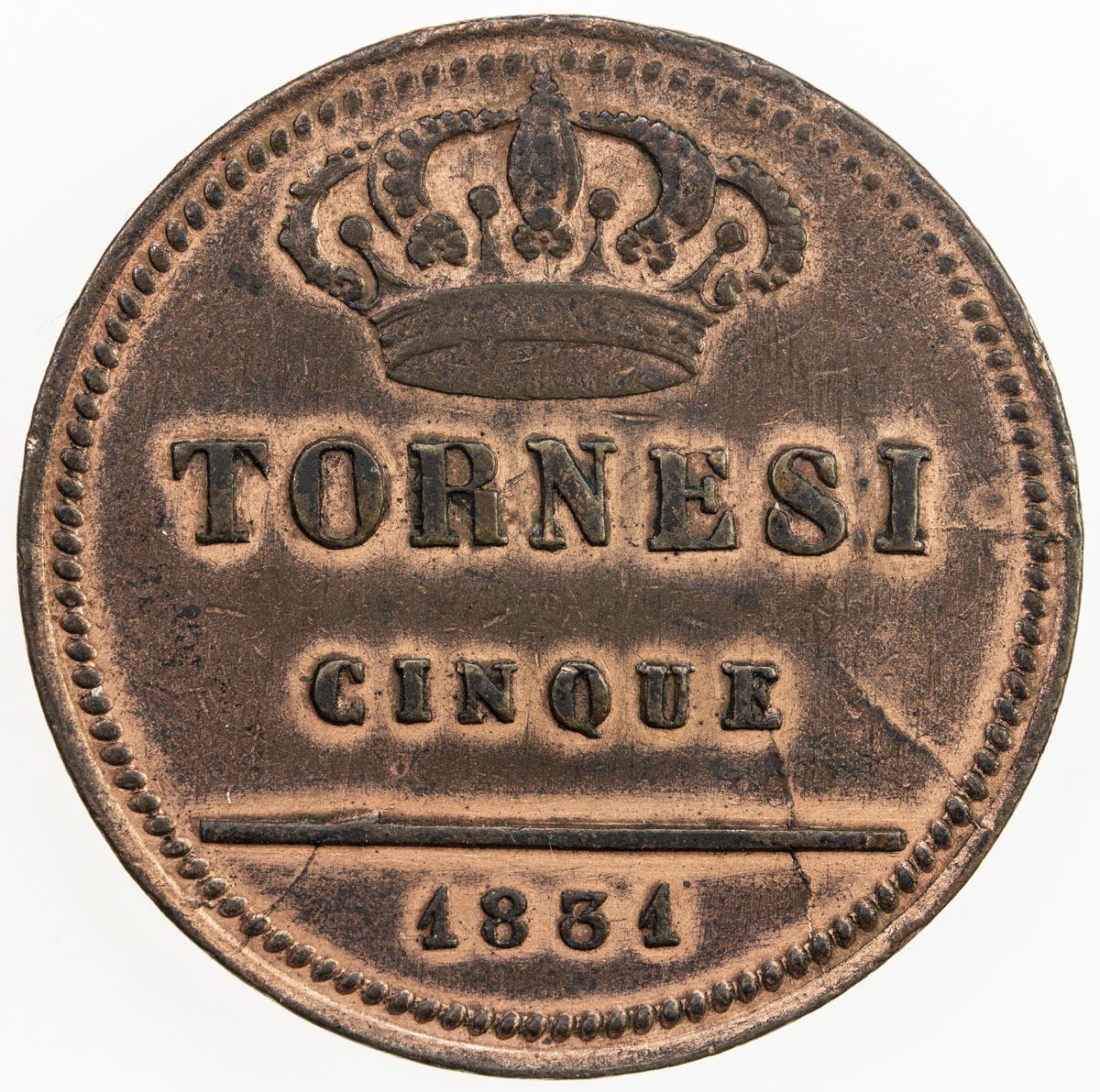 NAPLES: Ferdinando II, 1830-1859, AE 5 tornese, 1831, KM-305, lightly cleaned long ago, now retoning, much detail, rare type, EF, R, ex Wolfgang Schuster Collection.
