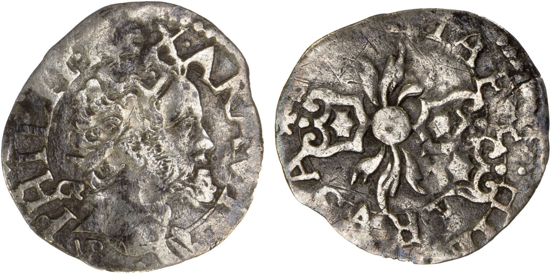 NAPLES: Filippo II, 1556-1598, AR grano (0.26g), ND, MIR-188/4, crowned head right with PHILIP.REX.ARA.VTRI around and small GR behind head // two lighters vertically arranged with dot in between, with flames coming out the sides of the dot and +(SICI)LIAE.HIERVSA around, reverse double-struck, and thus blundered, somewhat wavy flan, Fine, R3 (MIR).