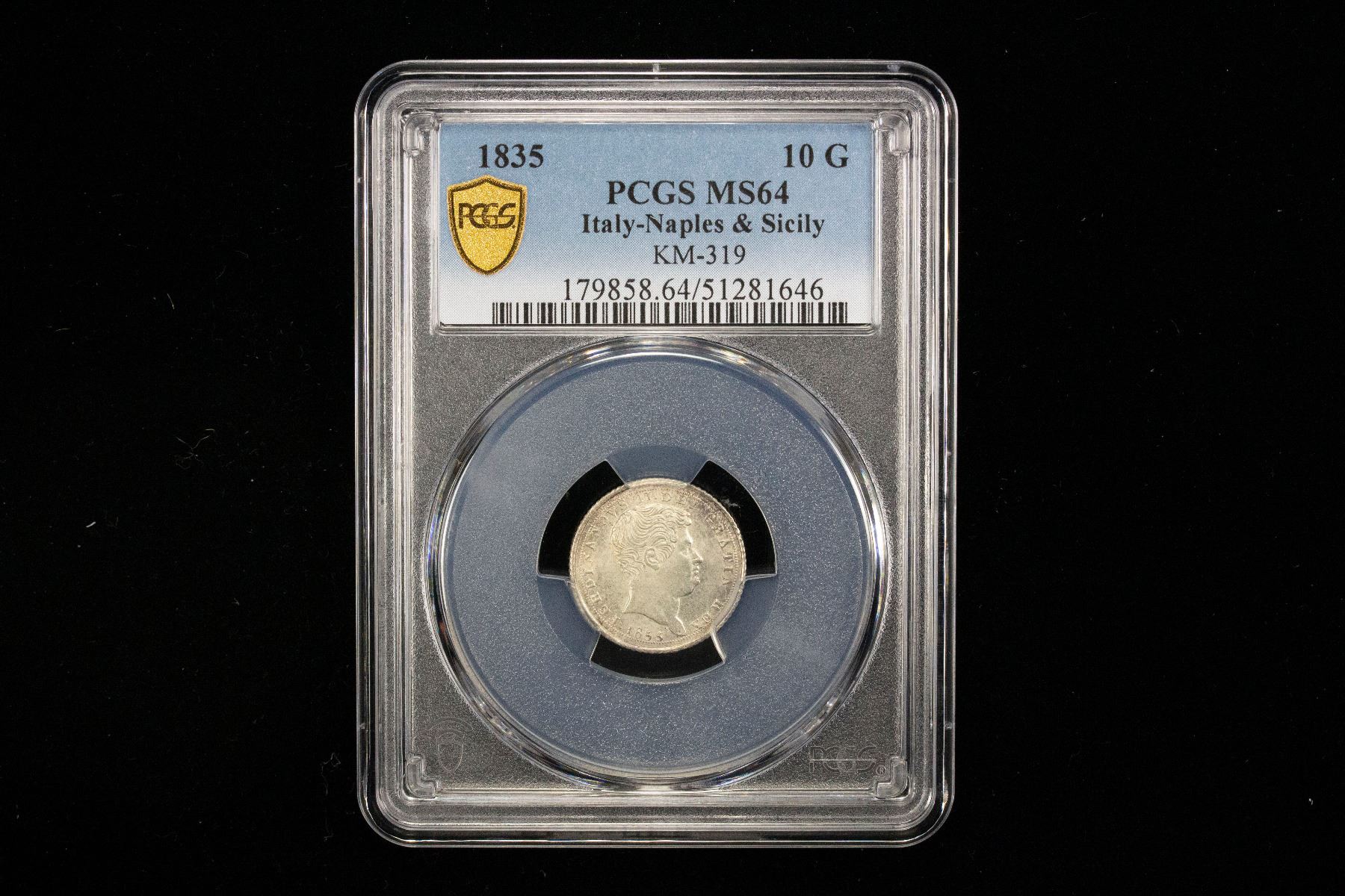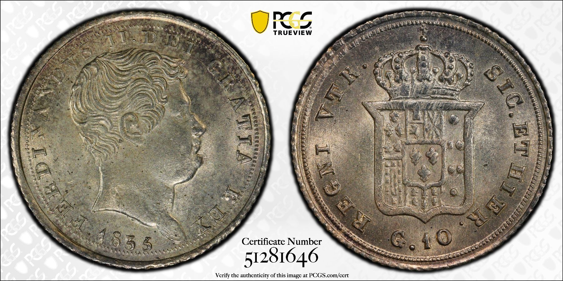 NAPLES & SICILY: Ferdinando II, 1830-1859, AR 10 grana, 1835, Cr-150, a wonderful lustrous mint state example! PCGS graded MS64.