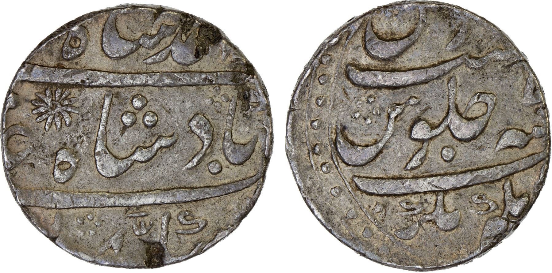 NAWABS OF BENGAL: AR rupee (11.57g), Jahangirnagar (Dhaka), AH117x year 7, Stv-BE38, KM-446.11, in the name of Ahmad Shah, with the 12-ray rosette on the obverse; 4 small edge tests on the obverse, but overall quite attractive, VF