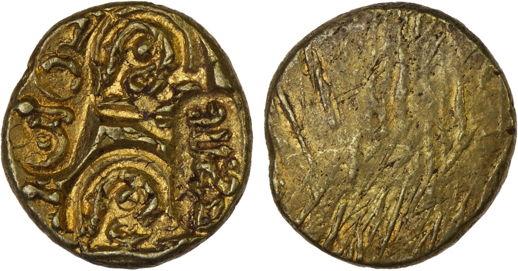 NELLORE: Bhujabala, 13th century, AV pagoda (3.47g), Mitch-KA-311/13, central lion, lion (x4), sri (x2), moon-scepter-sun, and name of Bhujabala, debased gold, VF-XF.