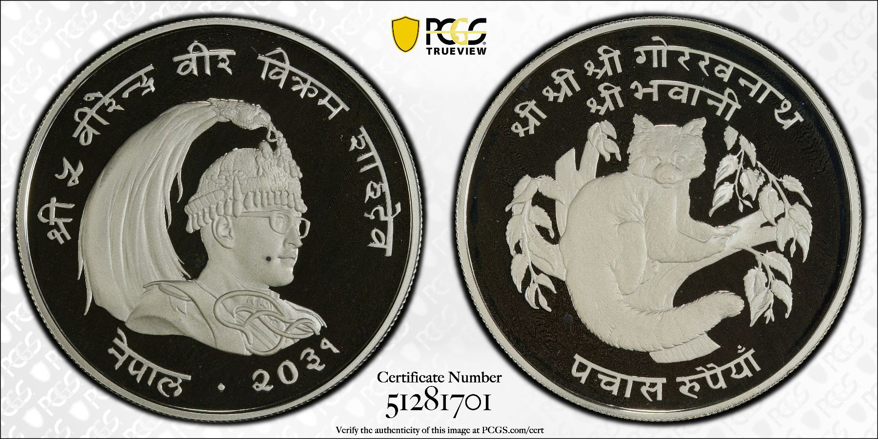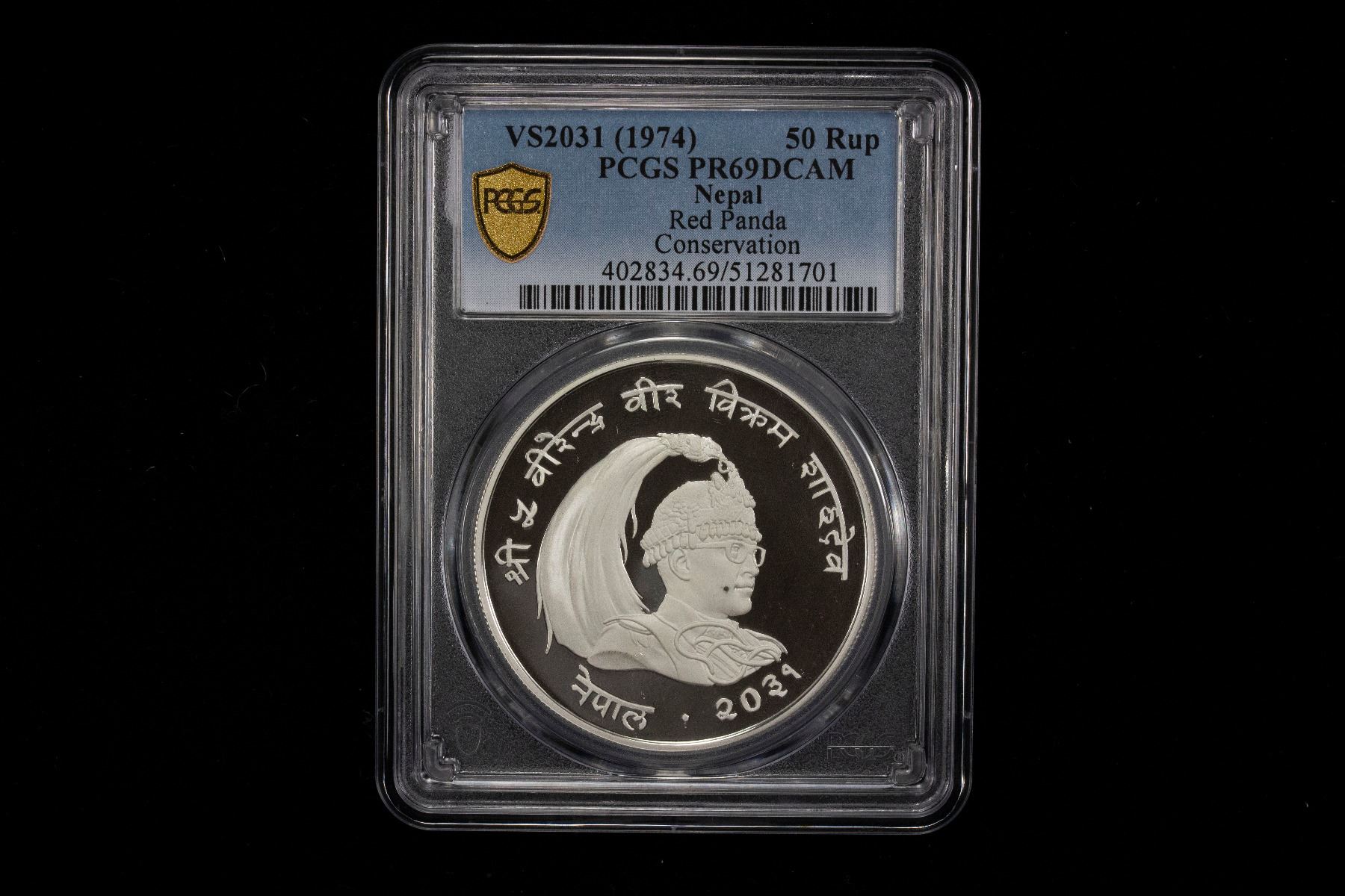 NEPAL: Birendra Bir Bikram, 1972-2001, AR 50 rupees, VS2031 (1974), KM-841a, Wildlife Conservation - Red Panda, struck at the British Royal Mint, PCGS graded Proof 69 DCAM.