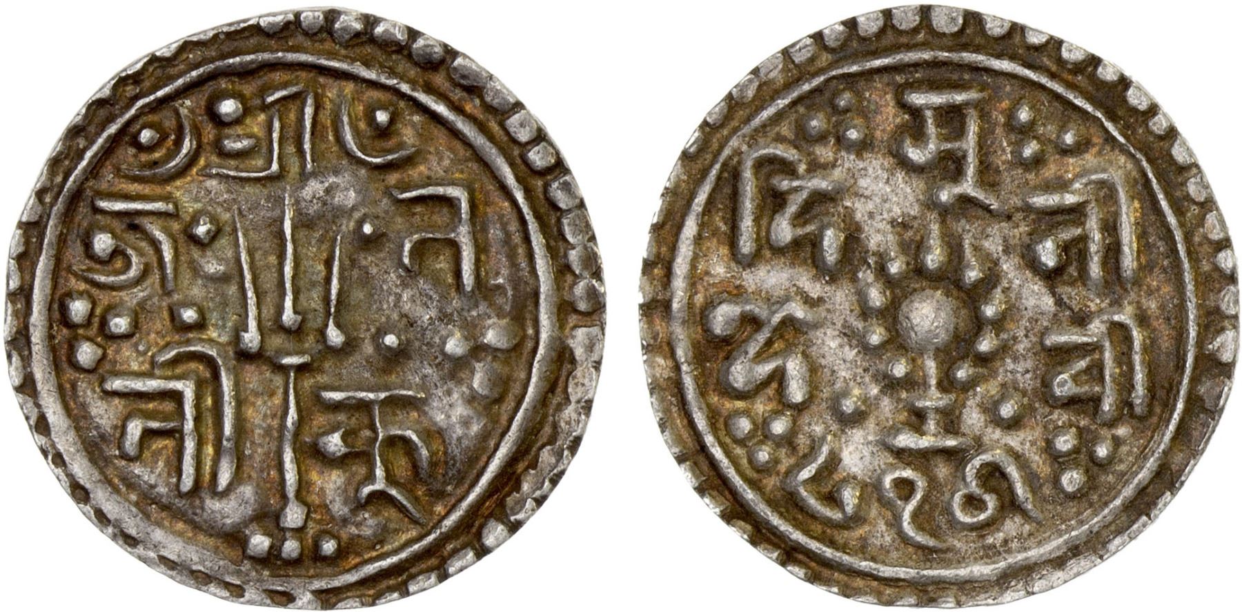NEPAL: KATHMANDU: Jaya Prakash Malla, first reign, 1735-1746, AR 1/4 mohar (1.35g), NS856 (1736), KM-234, struck in the name of the Queen Mother Kumndini Devi, nice original toning, one-year type, Choice XF.
