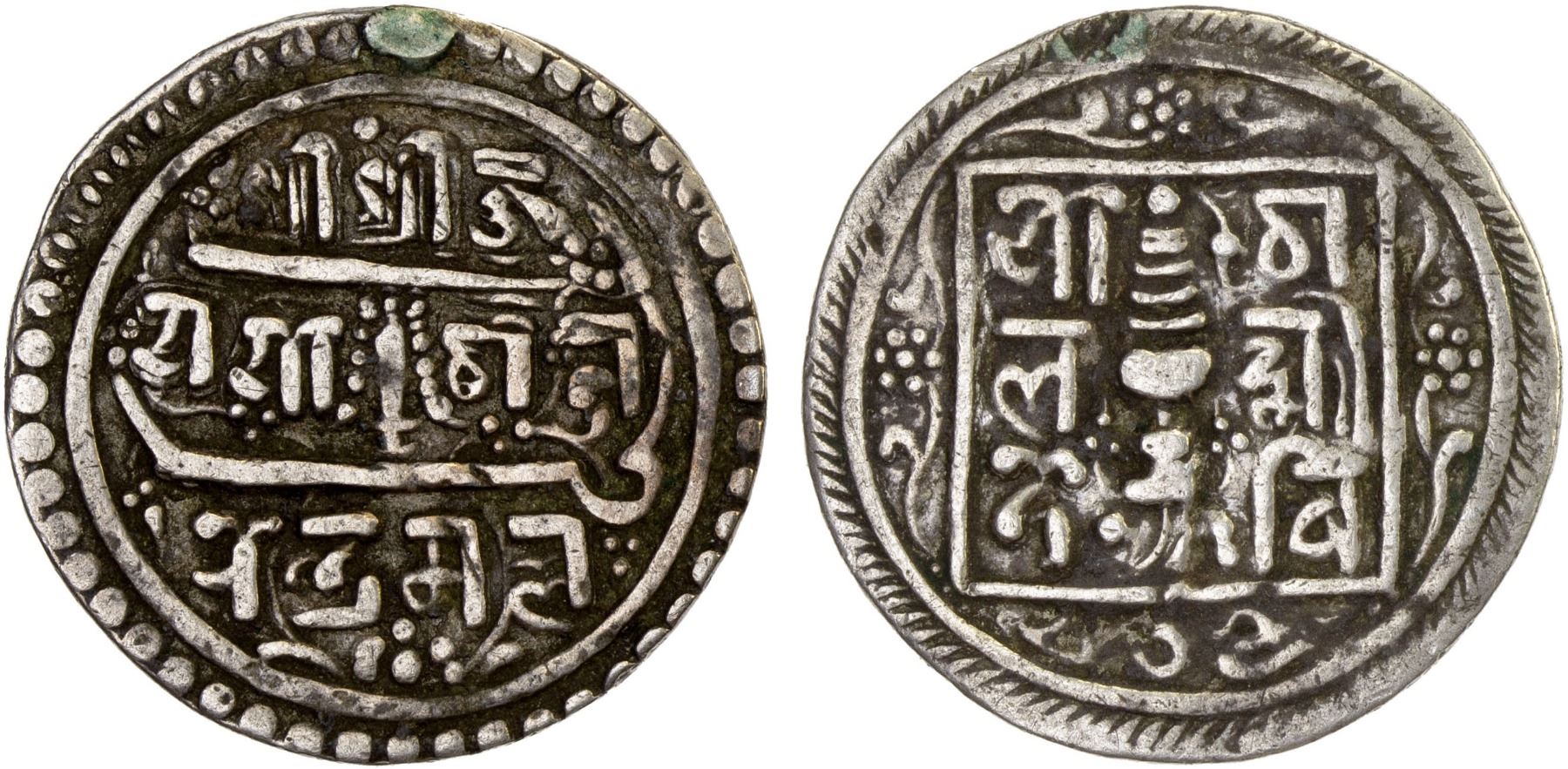 PATAN: Yoga Narendra Malla, 1684-1705, AR 1/2 mohar (2.71g), NE805 (1685), KM-322, Rh-402, sword with garland in center, Nepalese legend divided by two lines formed from pseudo-Persian letters, legend sri sri jaya yoga narendra malla // vermillion casket in center, 3-line legend around; mount removed, VF, RRR, ex Karl Gabrisch Collection. Just one example on CoinArchives, sold in the Spink Auction 25088, Lot 82.