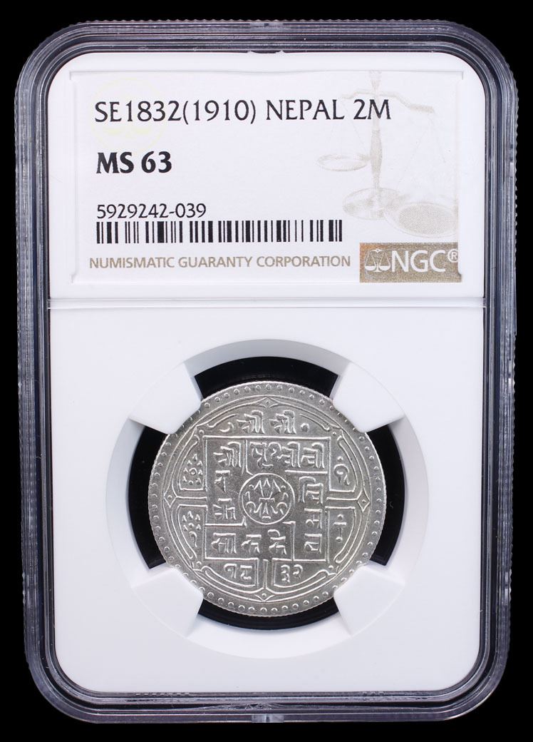 NEPAL: Prithvi Bir Bikram, 1881-1911, AR 2 mohars, SE1832 (1910), KM-656, a lovely example, NGC graded MS63.