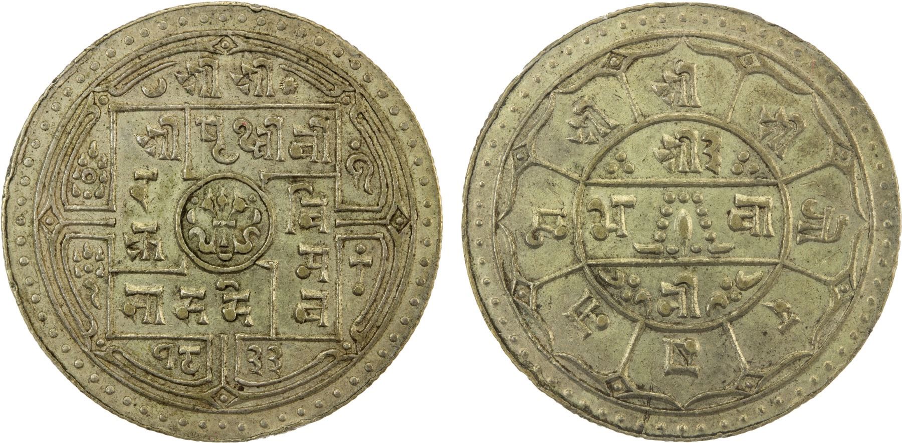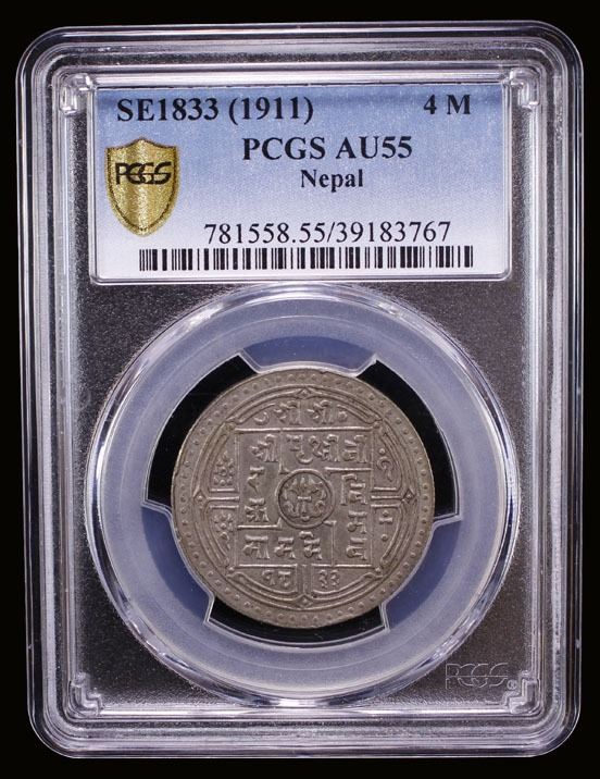 NEPAL: Prithvi Vira Vikrama, 1881-1911, AR 4 mohars, SE1833, KM-658, one-year type, a very attractive example! PCGS graded AU55, R, ex Wolfgang Schuster Collection.