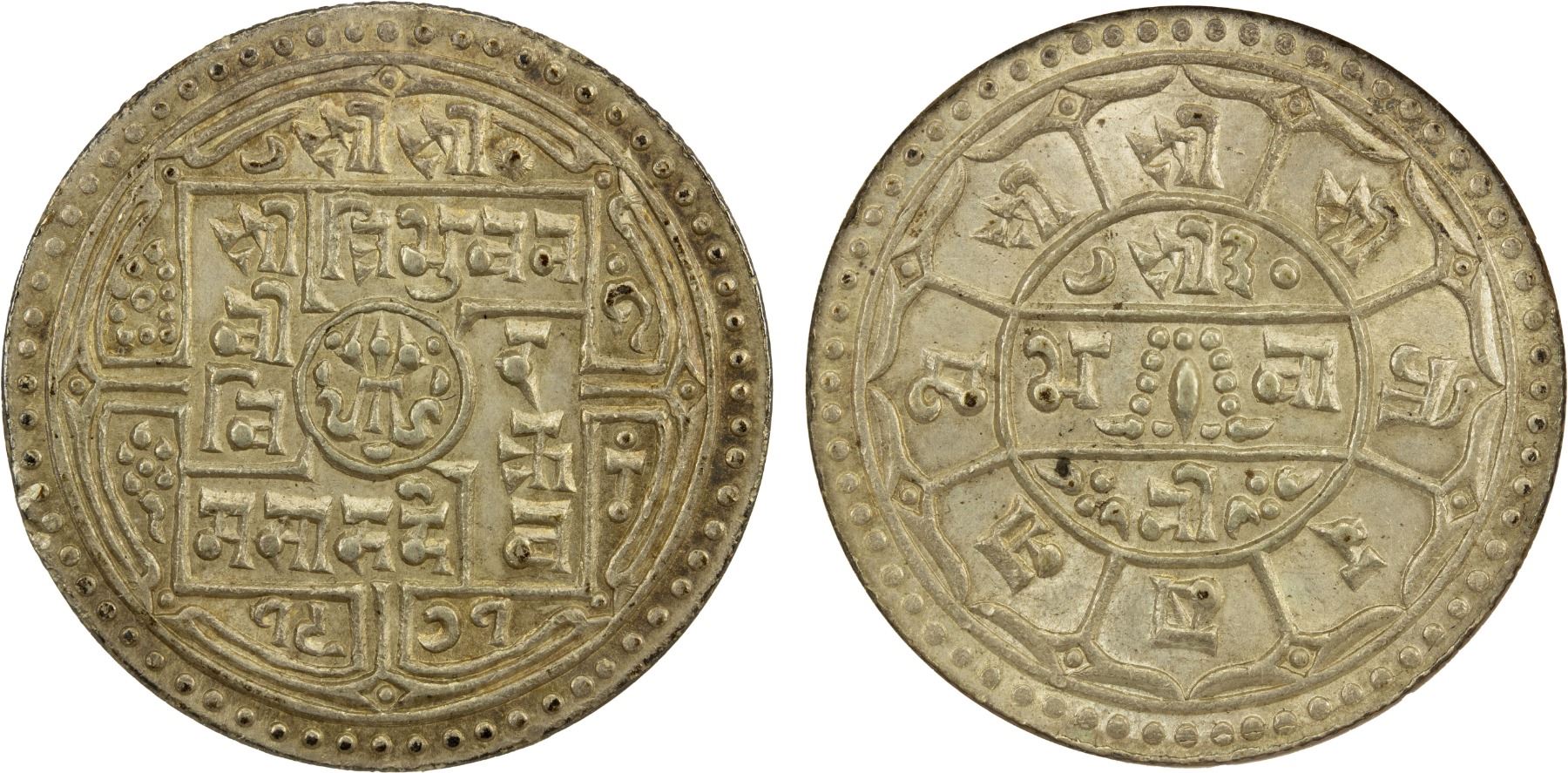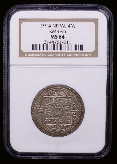 NEPAL: Tribhuvana Bir Bikram, 1911-1950, AR 4 mohars, VS1971, KM-696, rare one-year type, lightly toned, very attractive, NGC graded MS64, ex The 1914 Collection.