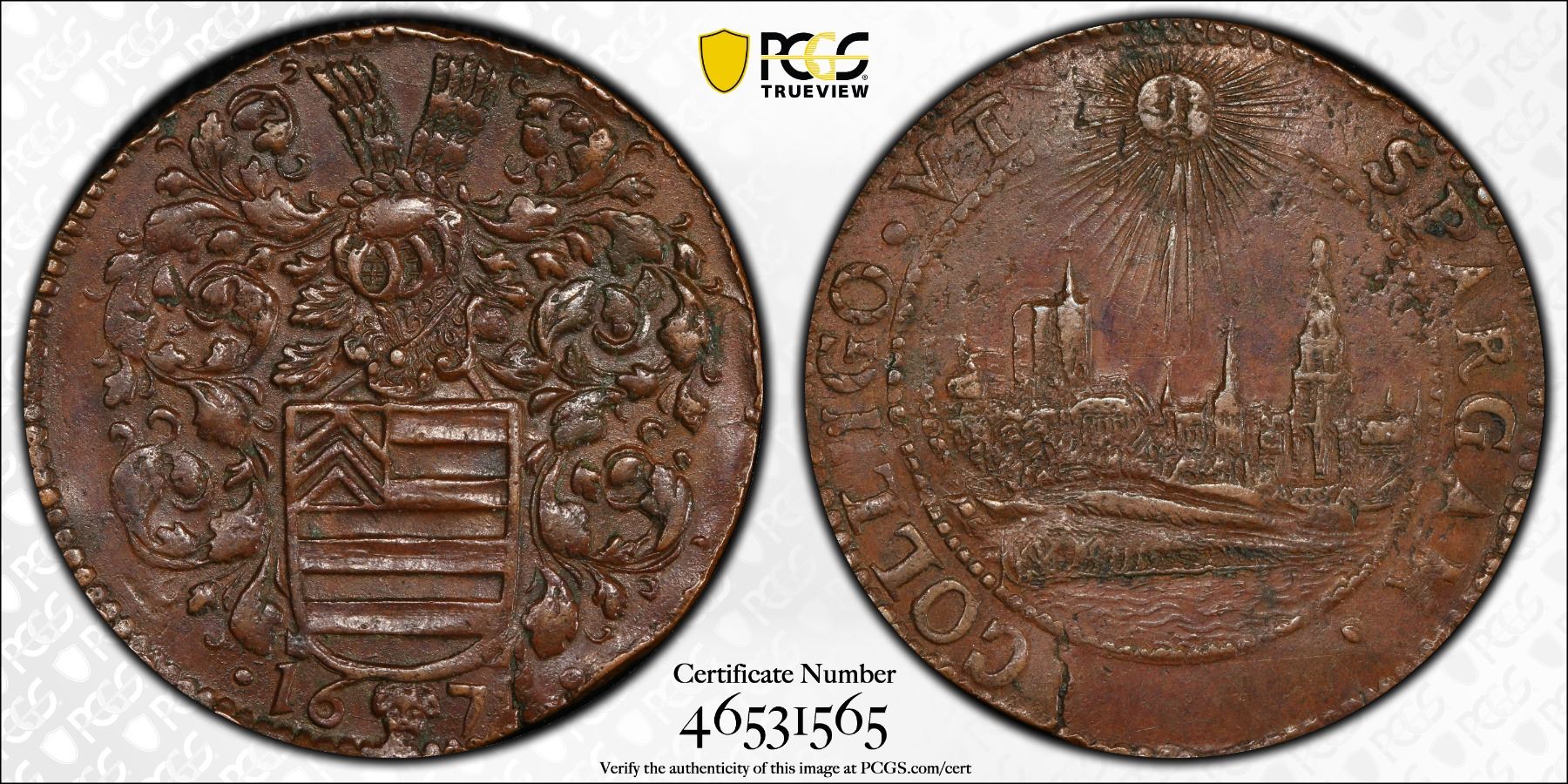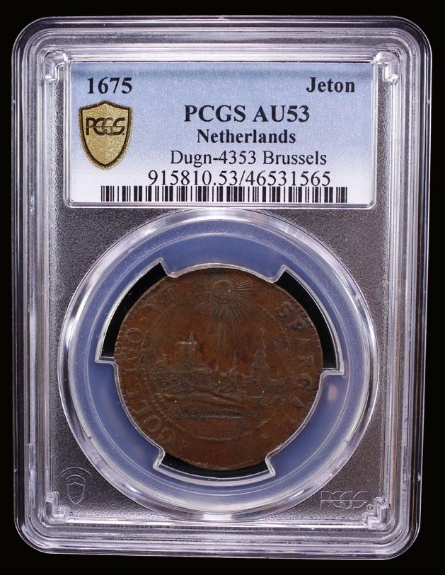 NETHERLANDS: AE jeton, 1675, Dugniolle-4353, 31mm bronze jeton by Philippe Godefroid Van de Wauwere, treasurer of Brussels, helmeted arms with date below // city view of Brussels with radiant sun above and COLLIGO VT - SPARGAM around, plain edge, PCGS graded AU53.