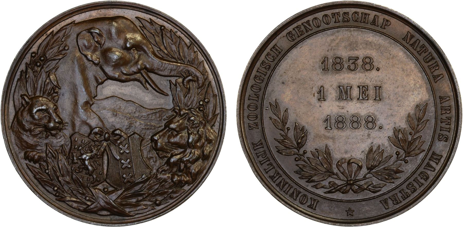 NETHERLANDS: AE medal (29.94g), 1888, Zwierzina-782, 43mm unsigned bronze medal for the 50th Anniversary of the Royal Zoological Society, elephant, lion and lioness, and two coats of arms, all within laurel wreath // half wreath of laurel with "1838 / 1 MEI / 1888." above and KONINKLIJK ZOOLOGISCH GENOOTSCHAP NATURA ARTIS MAGISTRA around, chocolate brown with luster, a stunning design, plain edge, AU.