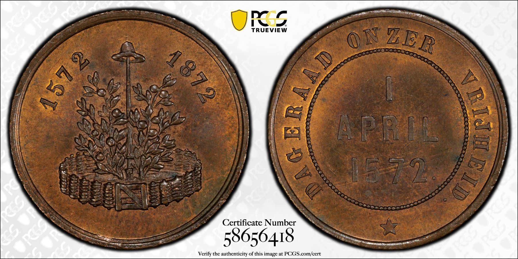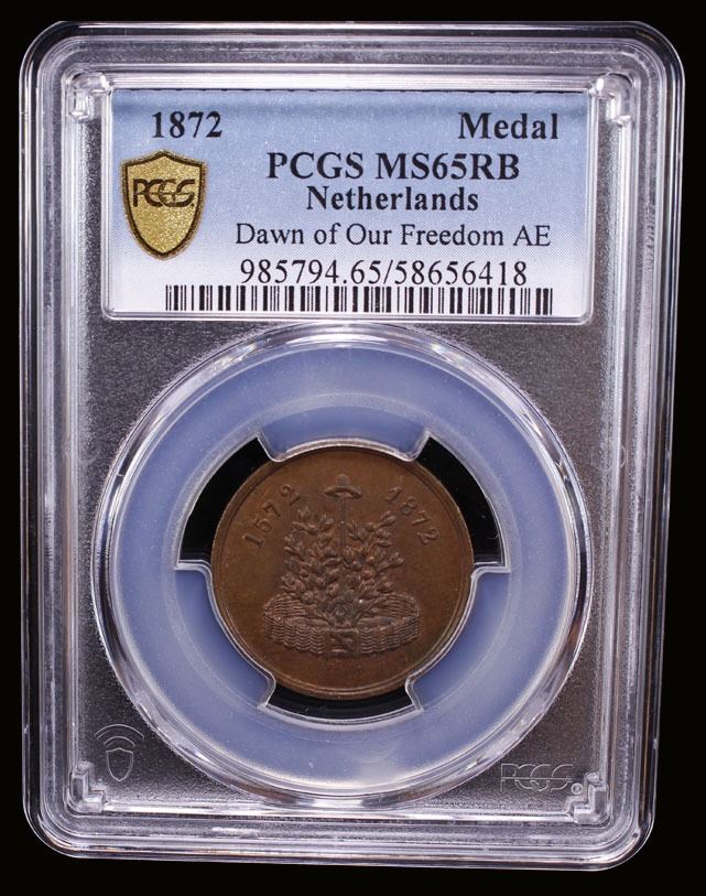 NETHERLANDS: AE medalet (6.47g), 1872, BM-68, 25mm bronze medalet commemorating the Capture of Brielle; "1572 /1872" above // DAGERAAD ONZER VRIJHEID in outer legend, 1 / APRIL / 1572 at center, a superb mint state example! PCGS graded MS65 RB. On April 1, 1572, Dutch Calvinist rebels, known as the Watergeuzen (Sea Beggars), captured the undefended port town of Brielle (Den Briel), a pivotal moment in the Eighty Years' War against Spain that marked the real beginning of the Dutch Revolt and led to the formation of the Dutch Republic.