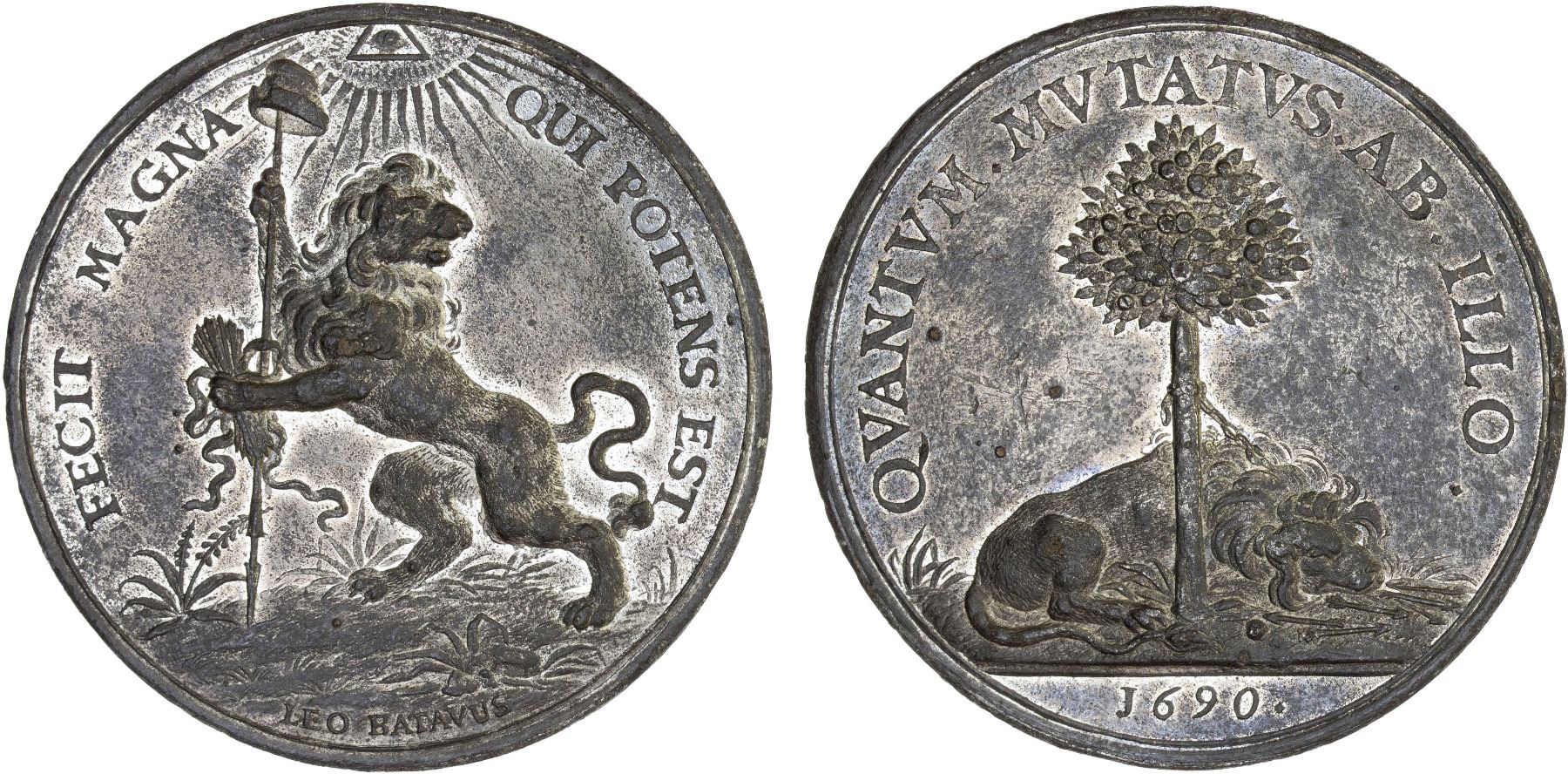 NETHERLANDS: Dutch Republic, tin medal (34.28g), 1690, B-1279, 49mm tin medal by Jan Smeltzing, FECIT MAGNA QUI POTENS EST (He that is mighty hath done great things) around the Dutch Lion, rampant, left, carrying the cap of Liberty on a staff and the arrows of the States, looking back with a menacing countenance; above, the Eye of Providence, LEO BATAVUS at bottom // QVANTVM MVTATVS AB ILLO (How changed from that) around the Dutch Lion asleep, chained to an orange tree, with arrows scattered on the ground, a very rare medal! AU. In 1690, following the Glorious Revolution and William III's ascension to the English throne, some of the Dutch populace felt discontented due to his focus on the Nine Years' War and his perceived preference for English advisors over Dutch ones, as well as his role in the Battle of the Boyne.