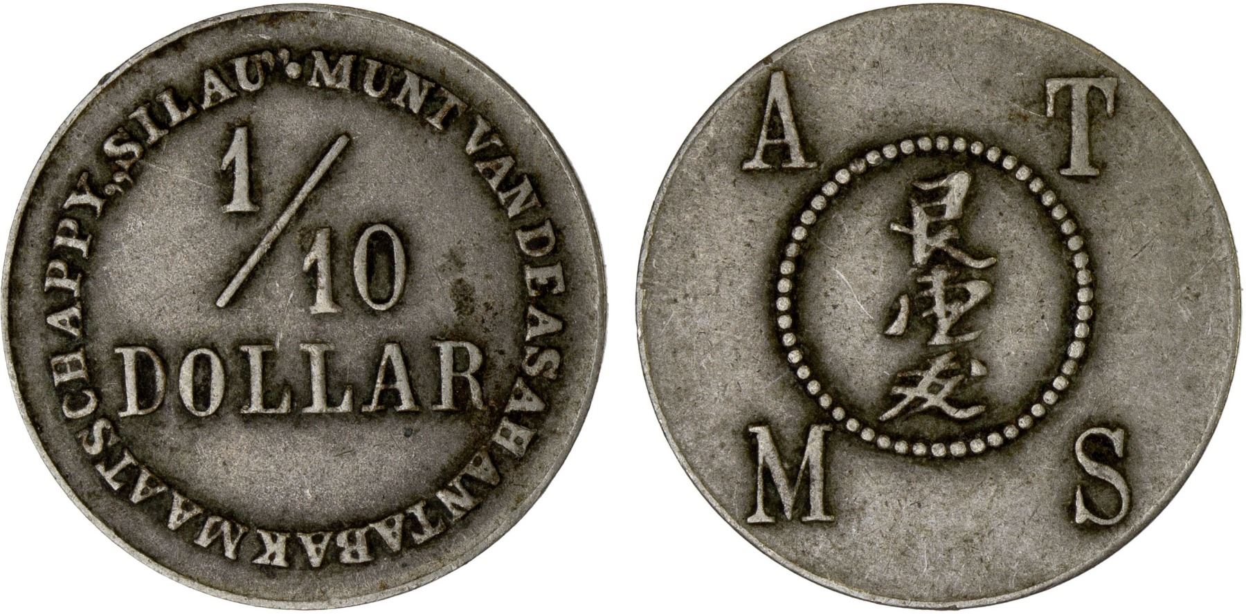 NETHERLANDS EAST INDIES: 1/10 dollar token, ND (ca. 1902-03), L&W-25, Sumatra copper-nickel plantation token, Asahan Tabak Maatschappij "Silau" (ATMS) company, XF.