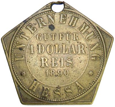NETHERLANDS EAST INDIES: 1 dollar token, 1890, L&W-119, Plantation token (Plantagegeld), pentagonal, uniface copper-nickel plantation reis token, Unternehmung Hessa, pierced, Fine to VF, RR.    Photo size reduced.