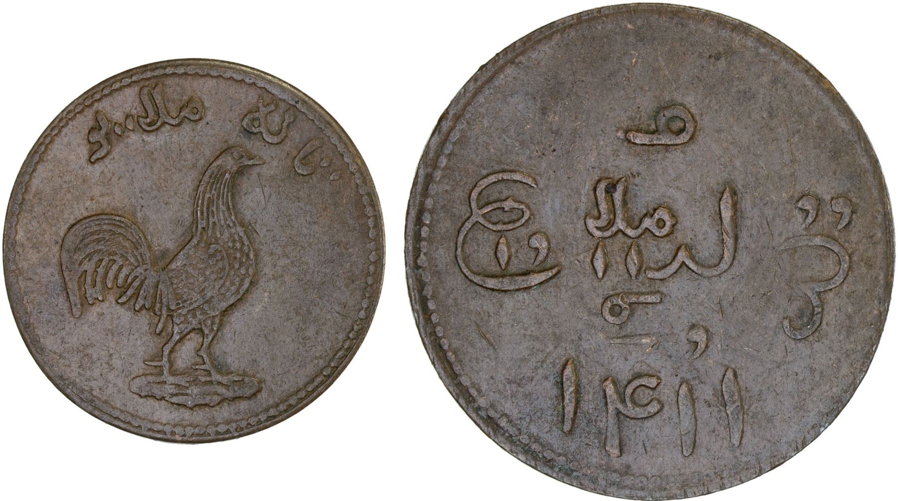NETHERLANDS EAST INDIES: AE keping, "AH1411" (ca. 1831), KM-Tn3, Prid-22, Singapore Merchants token, rooster right, dots in legend tanah melayu // fictitious hijri date, glossy brown patina, Choice XF. Singapore merchant tokens circulated in the Netherlands East Indies, as that was the intention of the issuers. These were forbidden to circulate by the Dutch authorities (though they didn't offer an alternative, so the ban had no effect) and have evasive inscriptions, notably dates and region names. All circulated indiscriminately among the islands as well as in Singapore, regardless of the area name on them and regardless of whether the area is today in Indonesia or Malaysia.
