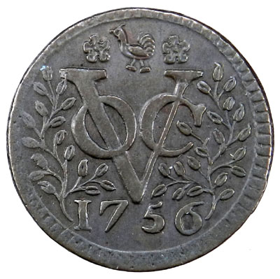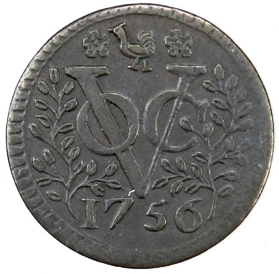 NETHERLANDS EAST INDIES: AR duit (2.84g), [West Friesland], 1756, KM-136a, muling of two reverses, each with monogram VOC between two branches, cock between 2 flowers above, choice Extremely Fine, R.