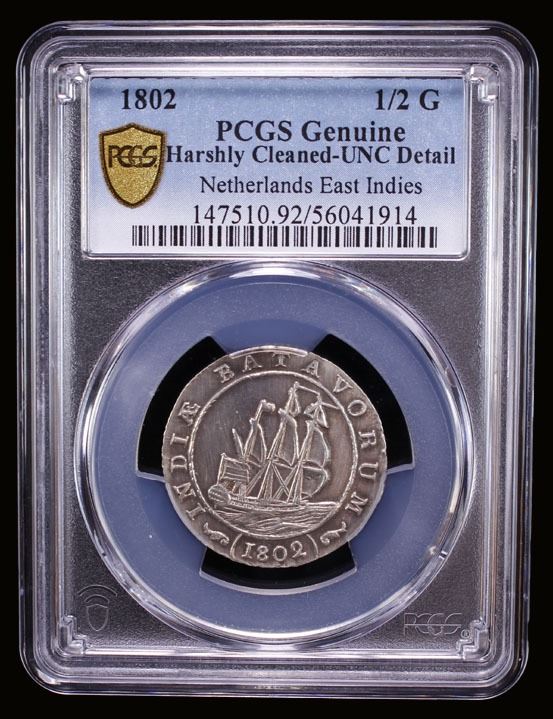 NETHERLANDS EAST INDIES: Batavian Republic, AR 1/2 gulden, 1802, KM-82, once harshly cleaned, PCGS graded Unc details.
