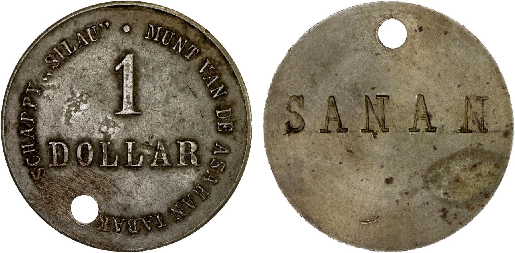 NETHERLANDS EAST INDIES: Plantation Tokens, 1 dollar token, ND (ca. 1902-13), LaWe-249b (plate example p.111), issued for the Asahan Tabak Maatschappij Silau, a tobacco and rubber plantation in North Sumatra, reverse smoothed out, stamped with the word SANAN, and holed at 12h, scratches around hole on obverse, extremely rare, XF.