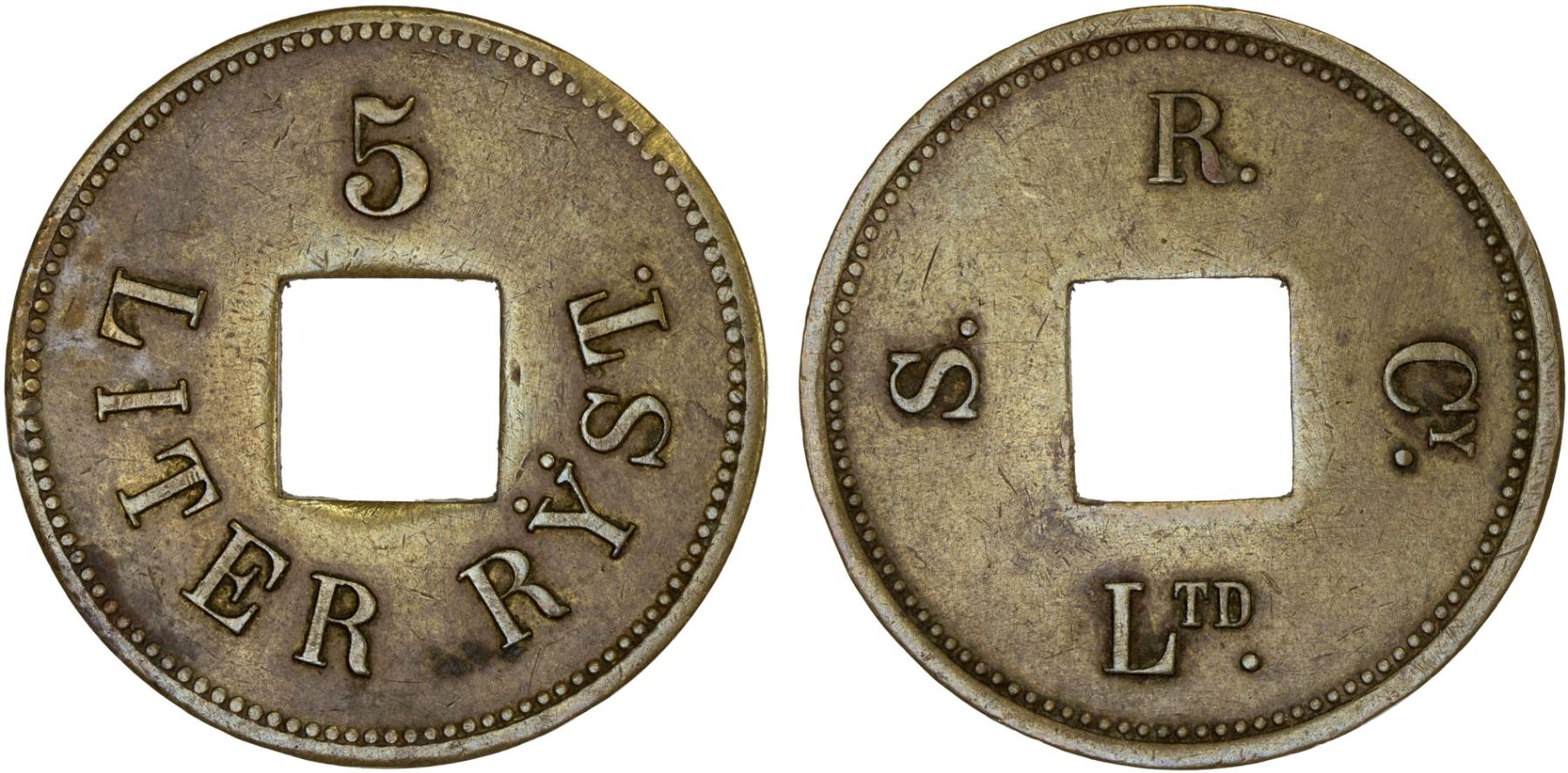 NETHERLANDS EAST INDIES: Plantation Tokens, brass 5 liter rice token, ND (ca. 1911-16), LaWe-433, issued for Sennah Rubber Company Limited, located on the east coast of Sumatra, round type, 5 LITER RYST // S. / R. / Cy. / Ltd., machine-punched square center hole (as made), a wonderful example of this extremely rare type, XF. Acquired by a previous owner (likely L. T. Wells Jr, the co-author of LaWe) in Jakarta in 1987.