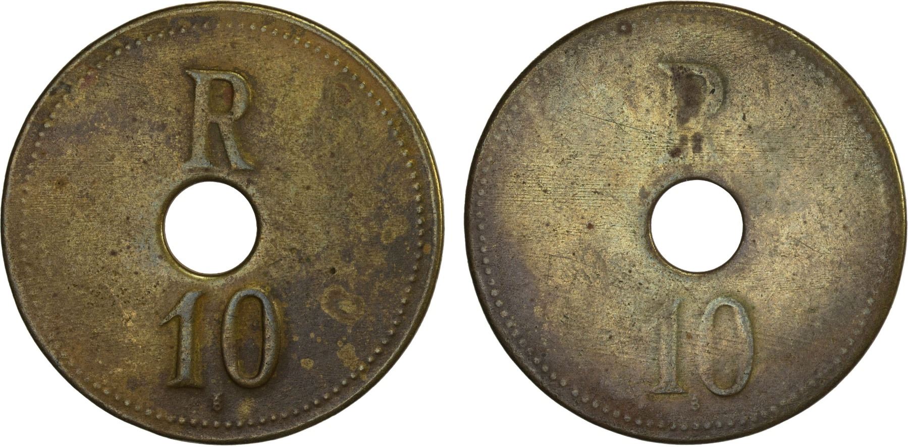 NETHERLANDS EAST INDIES: Plantation Tokens, brass token, ca. early 20th century, LaWe-574 (plate example), R above, 10 below, tiny B with caron at bottom, round hole in center, same design on both sides, issued for an uncertain plantation (likely from the east coast of Sumatra), lightly cleaned, Choice VF, ex L. T. Wells Jr. Collection. Acquired by a previous owner (likely L. T. Wells Jr, the co-author of LaWe) in Jakarta in 1986.