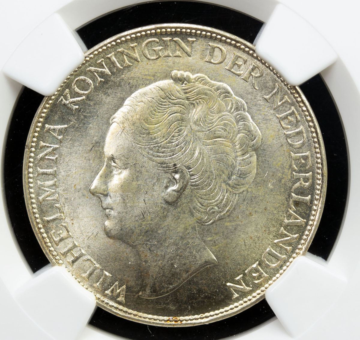 NETHERLANDS EAST INDIES: Wilhelmina, 1890-1948, AR gulden, 1943-D, KM-330, with palm tree privy mark, NGC graded MS63. The Japanese Empire occupied the Netherlands East Indies during World War II from 1942 through 1945. Subsequently, the Dutch Government had the American Government strike bronze and silver coins at the San Francisco, Denver and Philadelphia mints during this time period. TheU.S. Mint in Denver struck some 20 million silver one gulden and 2 million 2½ gulden coins in anticipation of the eventually liberation of the colony from the Japanese.