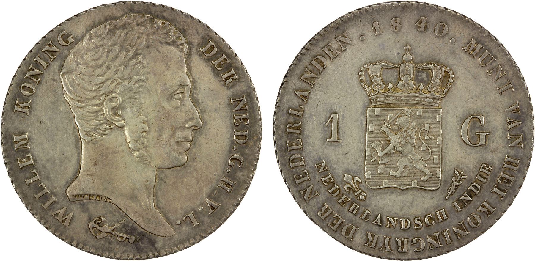 NETHERLANDS EAST INDIES: Willem I, 1815-1840, AR gulden, 1840, KM-300a, Cr-74a, nicely toned, two-year type, XF.