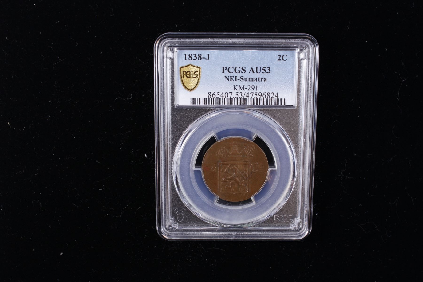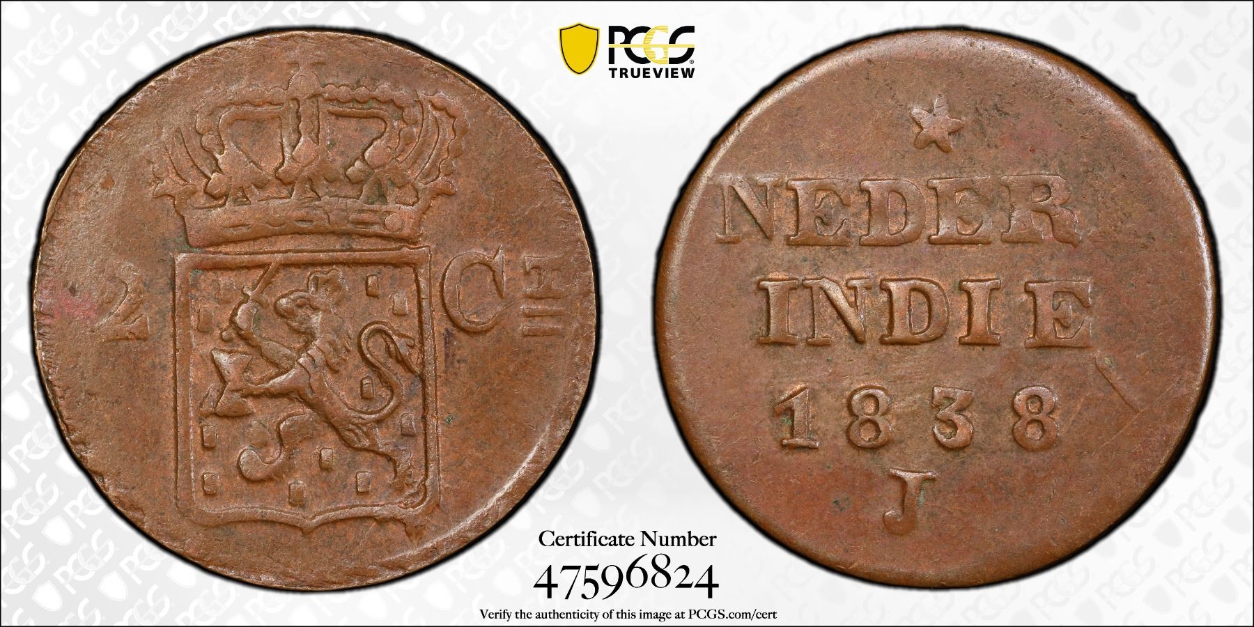 NETHERLANDS EAST INDIES: Willem I, 1816-1840, AE 2 cents, 1838, initial J, rich brown patina with traces of original red, PCGS graded AU53.
