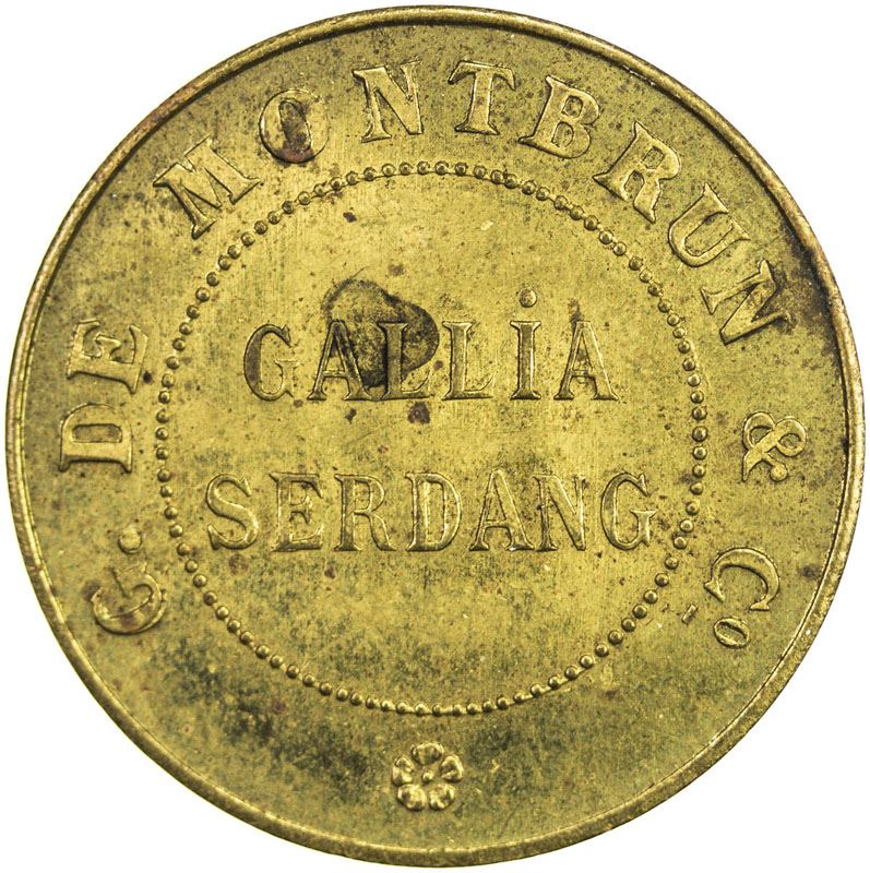 NETHERLANDS EAST INDIES: brass 50 cent, ND (ca. 1890-1897), L&W-78a, plantation token (plantagegeld), G. de Montbrun, Sumatra, GALLIA - SERDANG at center, Unc, R.
