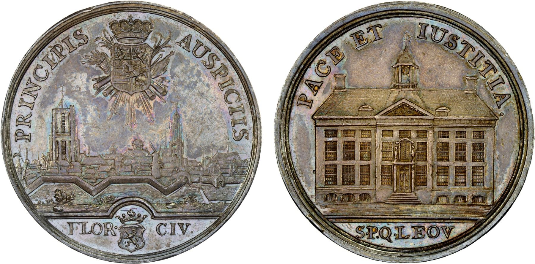 NETHERLANDS: United Netherlands, AR medal (15.25g), ND (1774), van Loon supp.-653, van Orden-XXI.34, 35mm silver Leeuwarden (city) attendance medal by J. G. Holtzhey, view of the city walls and city, with the crowned coat of arms of Orange above and crowned coat of arms of Leeuwarden between FLOR - CIV. // front view of the city hall with PACE ET - IUSTITIA around and S.P.Q.LEOV in exergue, many small contact marks, nicely toned, tiny reverse rim cud, plain edge, XF.