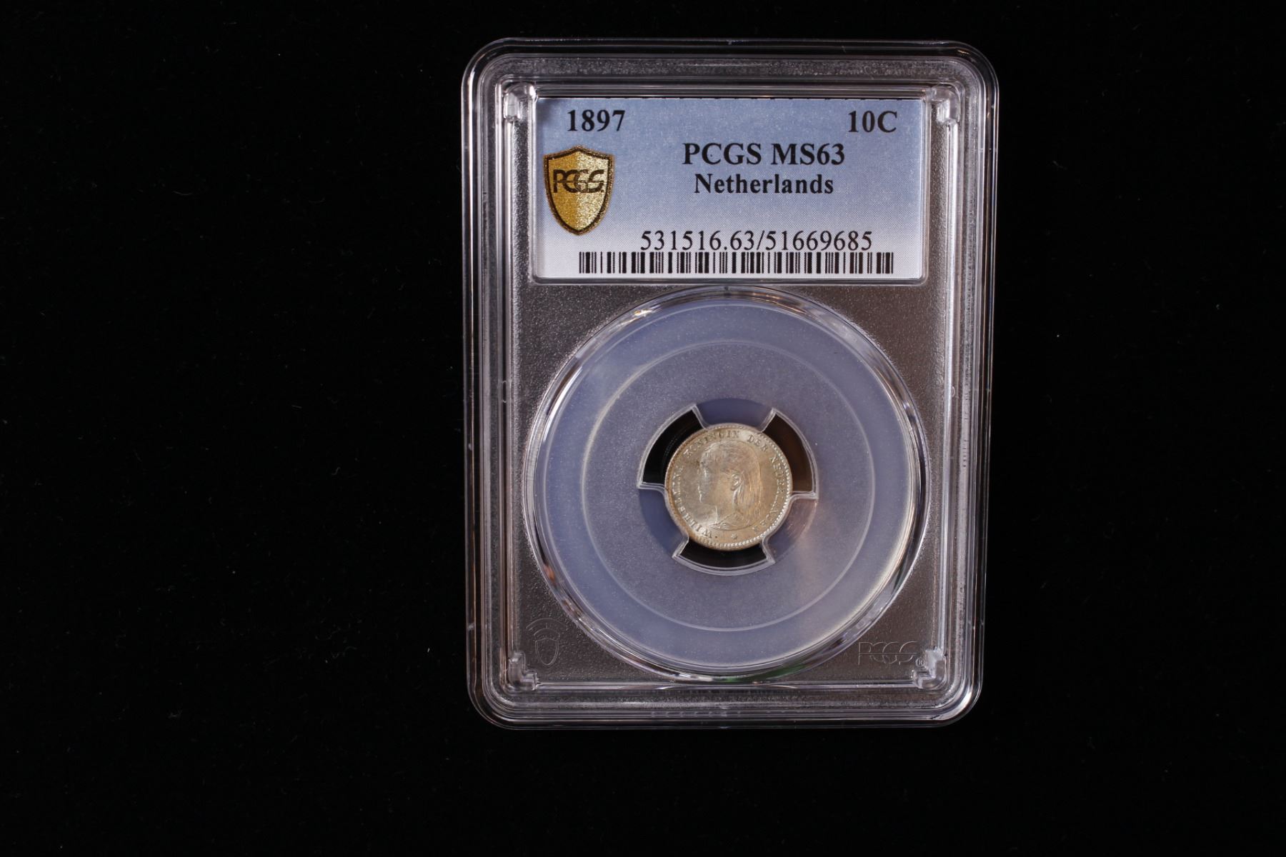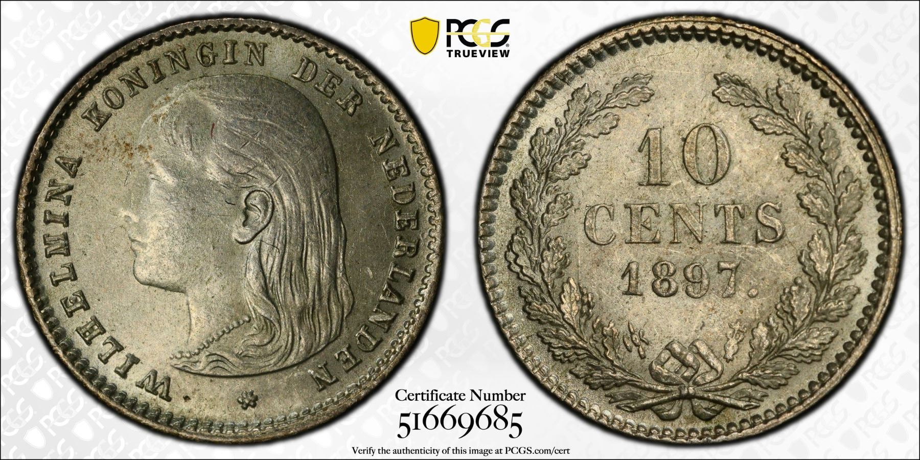 NETHERLANDS: Wilhelmina I, 1890-1948, AR 10 cents, 1897, PCGS MS63