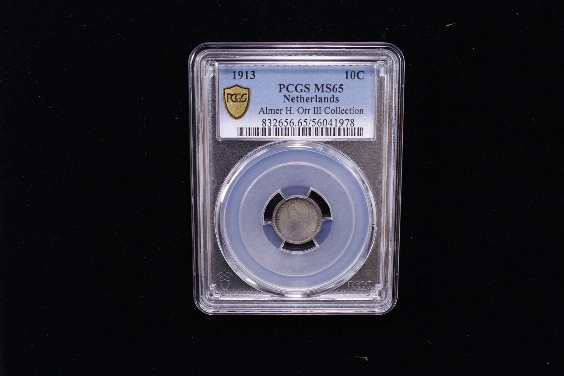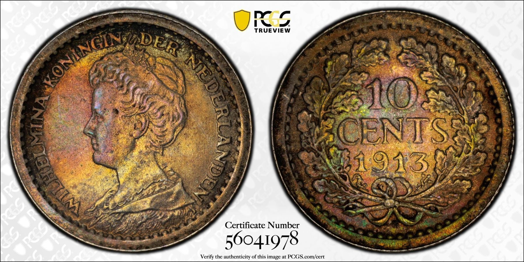 NETHERLANDS: Wilhelmina I, 1890-1948, AR 10 cents, 1913, KM-145, better date, beautiful multicolored tone, PCGS graded MS65, ex Almer H. Orr III Collection.