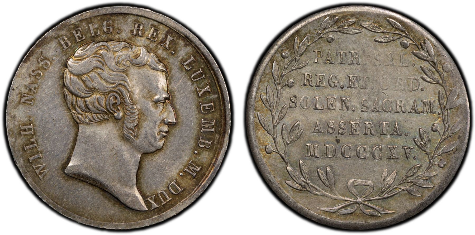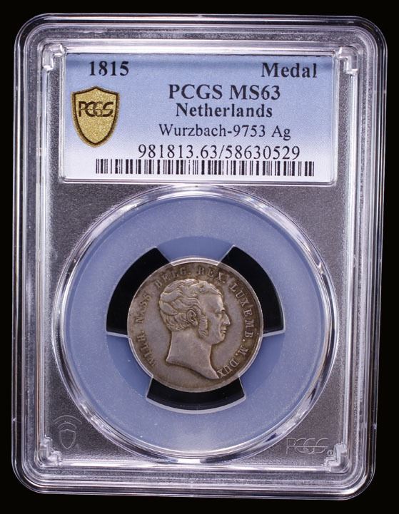 NETHERLANDS: Willem I, 1815-1840, AR jeton, 1815, Wurzbach-9753, 23mm silver jeton by Pieter Walter van de Goor for William taking the Oath to the Constitution; WILH. NASS. BELG. REX. LUXEMB. M. DUX around bust right // PATR. SAL. / REG. ET. ORD. / SOLEN. SACRAM. / ASSERTA. / MDCCCXV within wreath, a lovely lightly toned mint state example! PCGS graded MS63. Engraved by Pieter Walter van de Goor, who was first employed at the Brussels Mint and was later engraver at the Utrecht Mint.