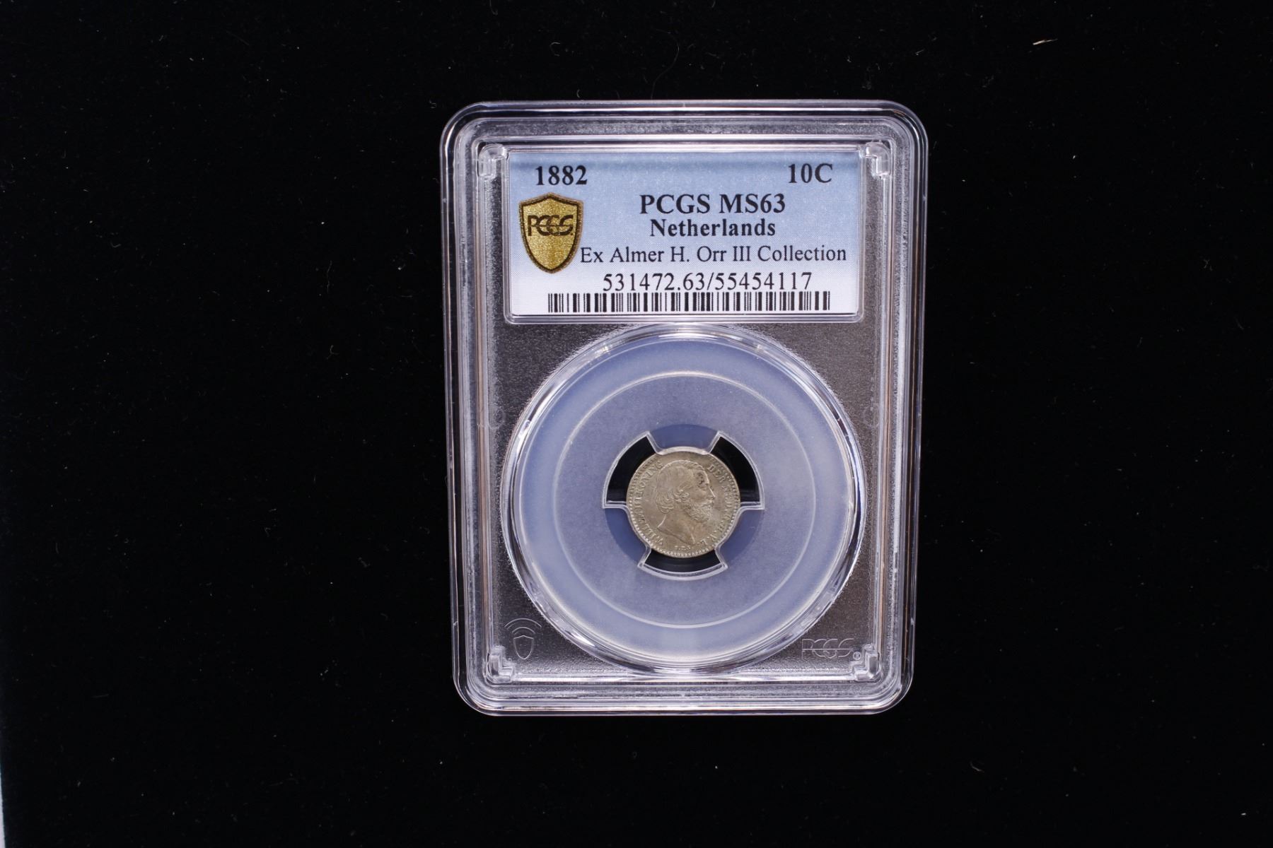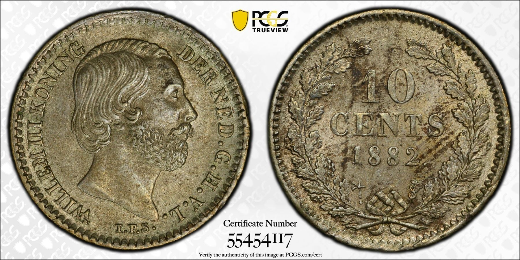 NETHERLANDS: Willem III, 1849-1890, AR 10 cents, 1882, KM-80, broadaxe privy mark, dot after date, PCGS graded MS63, ex Almer H. Orr III Collection.