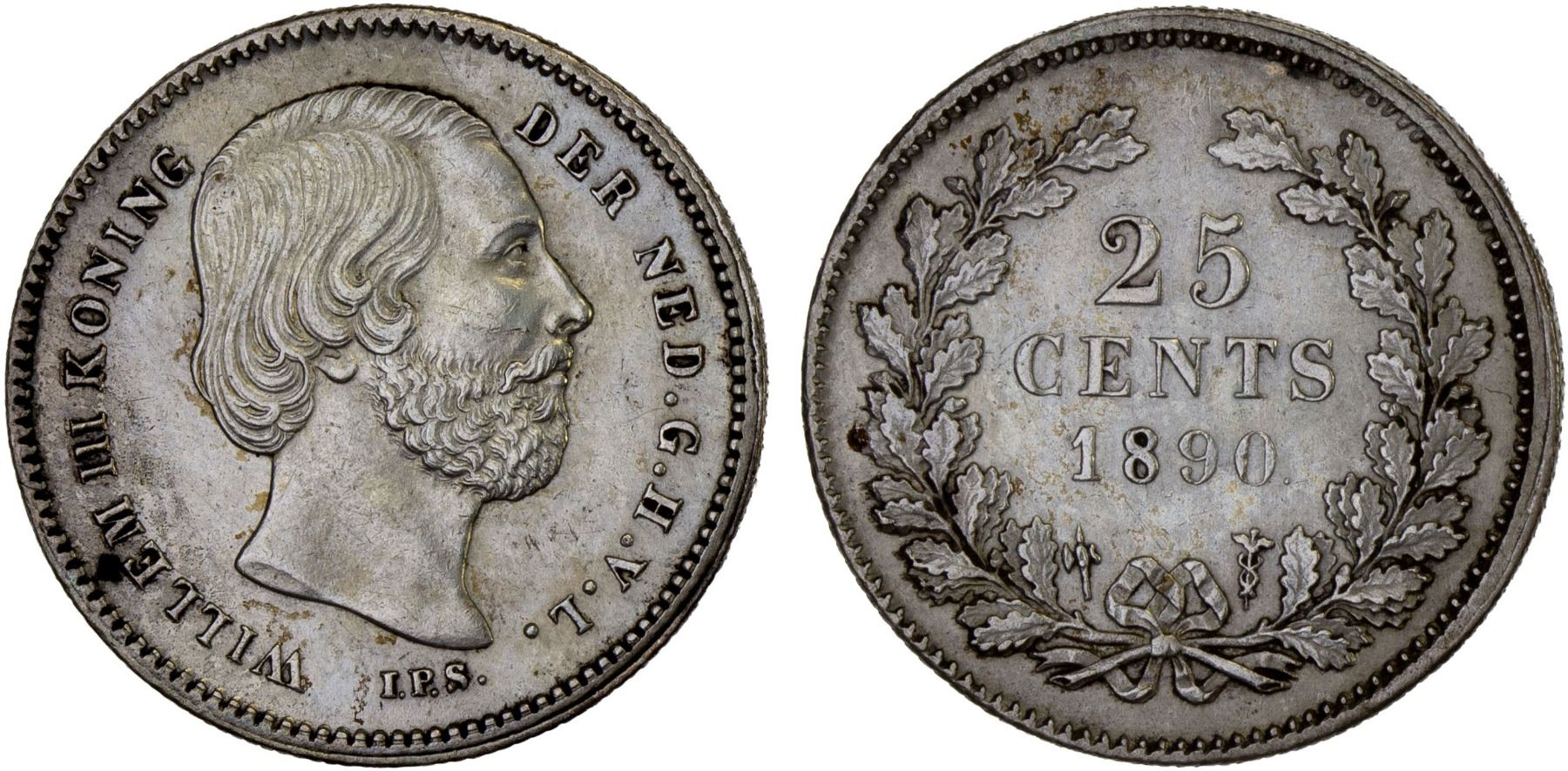 NETHERLANDS: Willem III, 1849-1890, AR 25 cents, 1890, AU