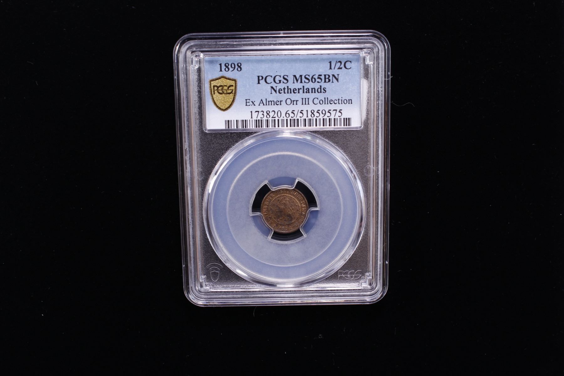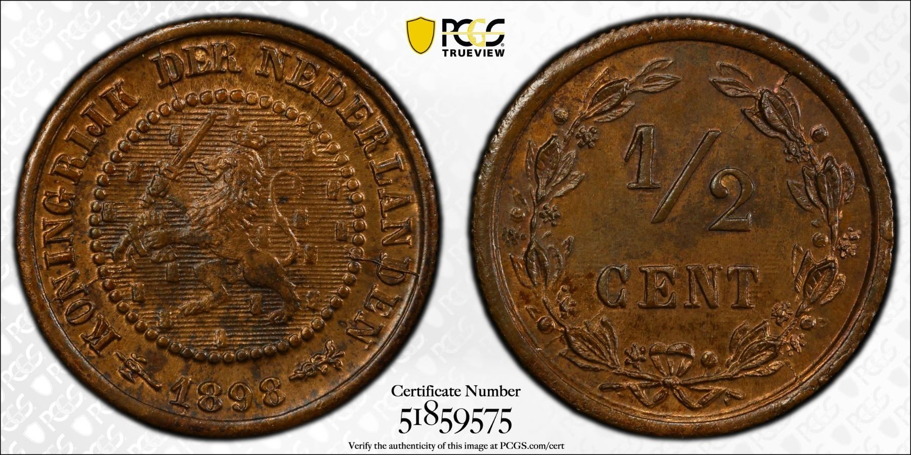 NETHERLANDS: William III, 1849-1890, AE 1/2 cent, 1898, KM-109, Y-3, a superb example, PCGS graded MS65 BN, ex Almer H. Orr III Collection.