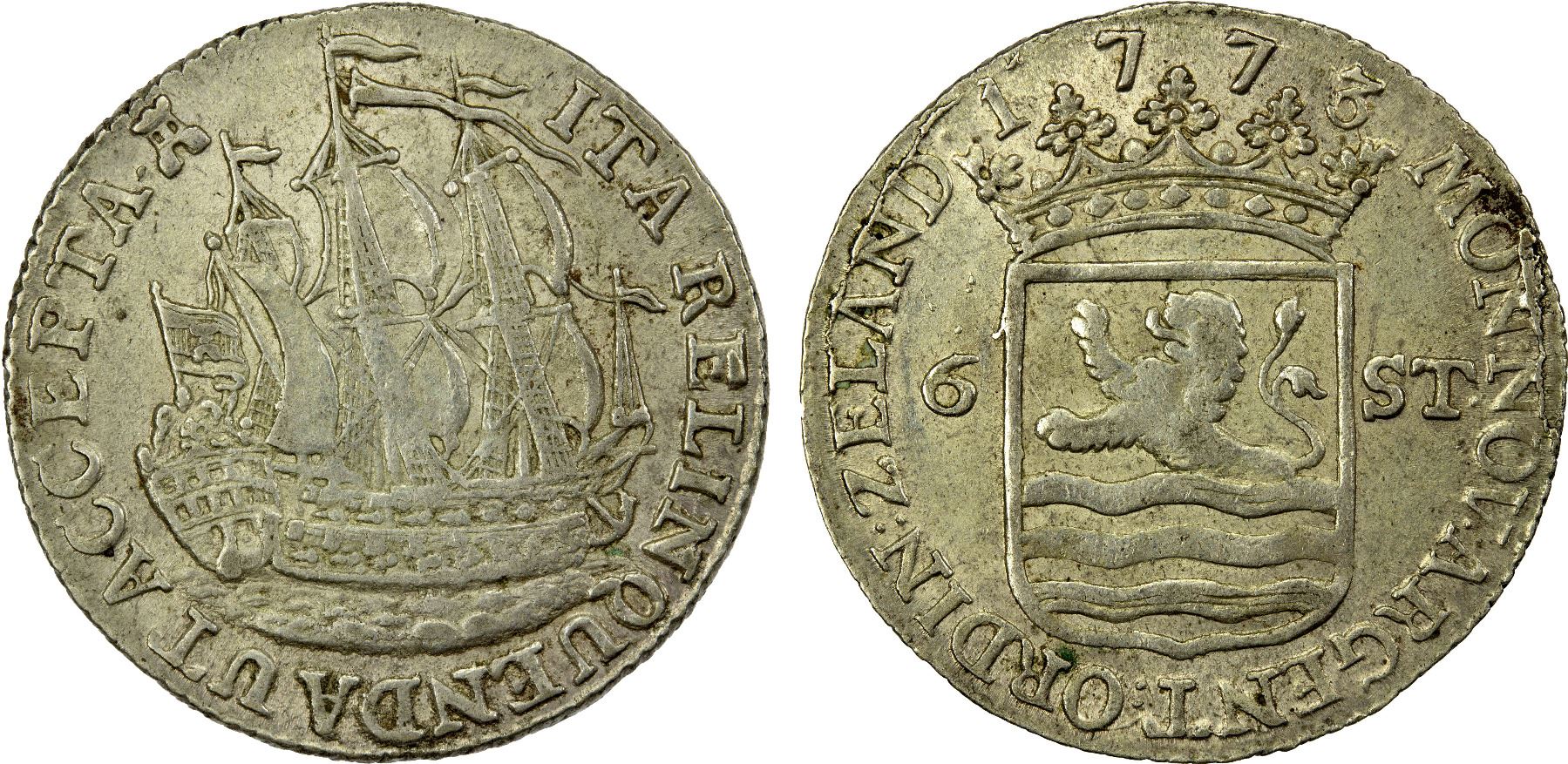 NETHERLANDS: ZEELAND: AR 6 stuivers, 1773, KM-90.2, sailing ship, very lightly toned, AU, ex Joe Sedillot Collection.