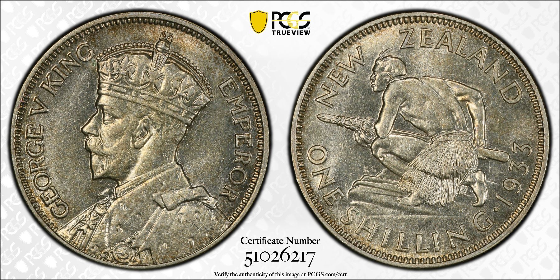 NEW ZEALAND: George V, 1910-1936, AR shilling, 1933, KM-3, a lovely example, PCGS graded MS63, ex Almer H. Orr III Collection.