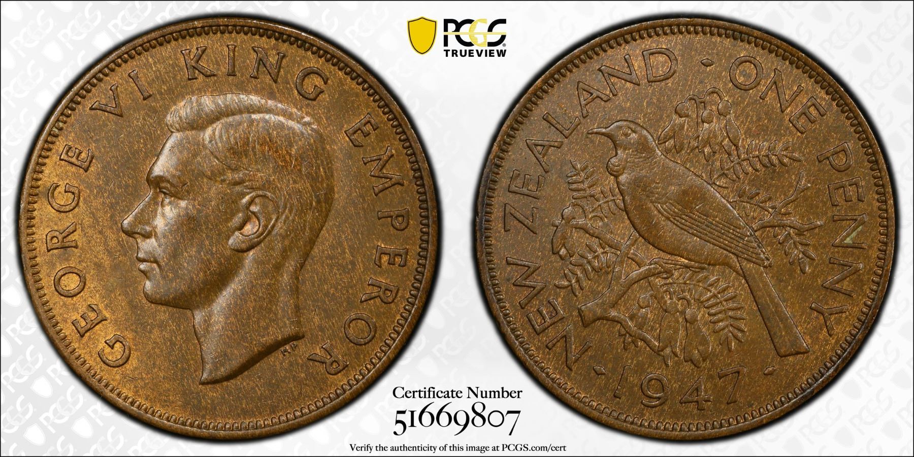 NEW ZEALAND: George VI, 1936-1952, AE penny, 1947, KM-13, Y-8, a wonderful lustrous example! PCGS graded MS64 BN, ex Almer H. Orr III Collection.