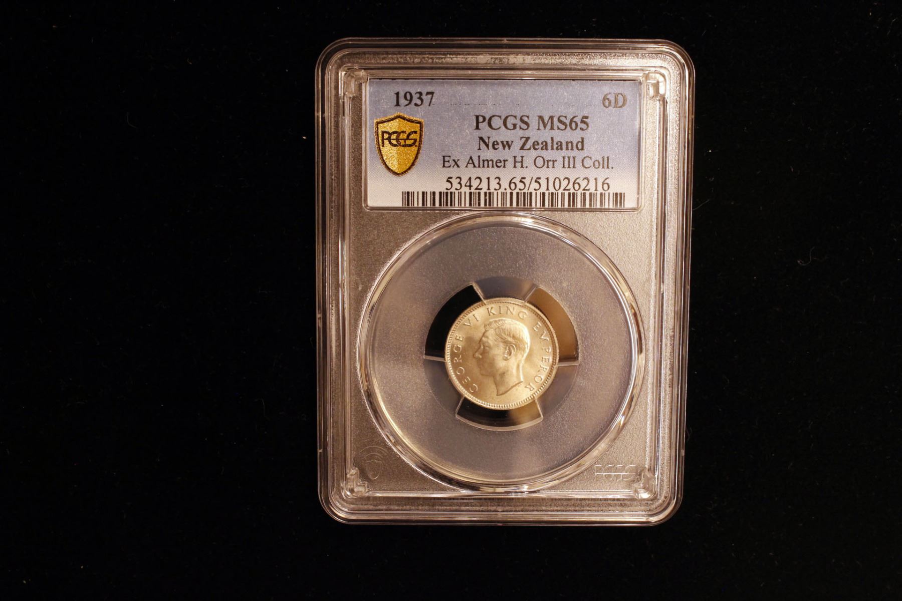 NEW ZEALAND: George VI, 1936-1952, AR 6 pence, 1937, KM-8, a superb example, PCGS graded MS65, ex Almer H. Orr III Collection.