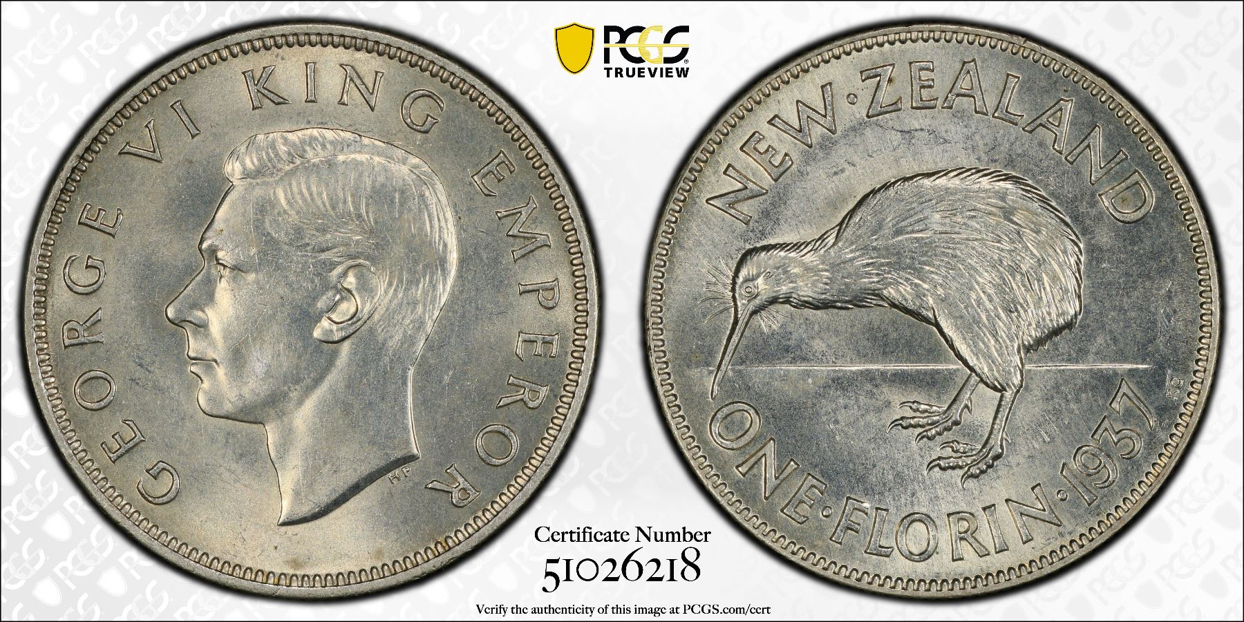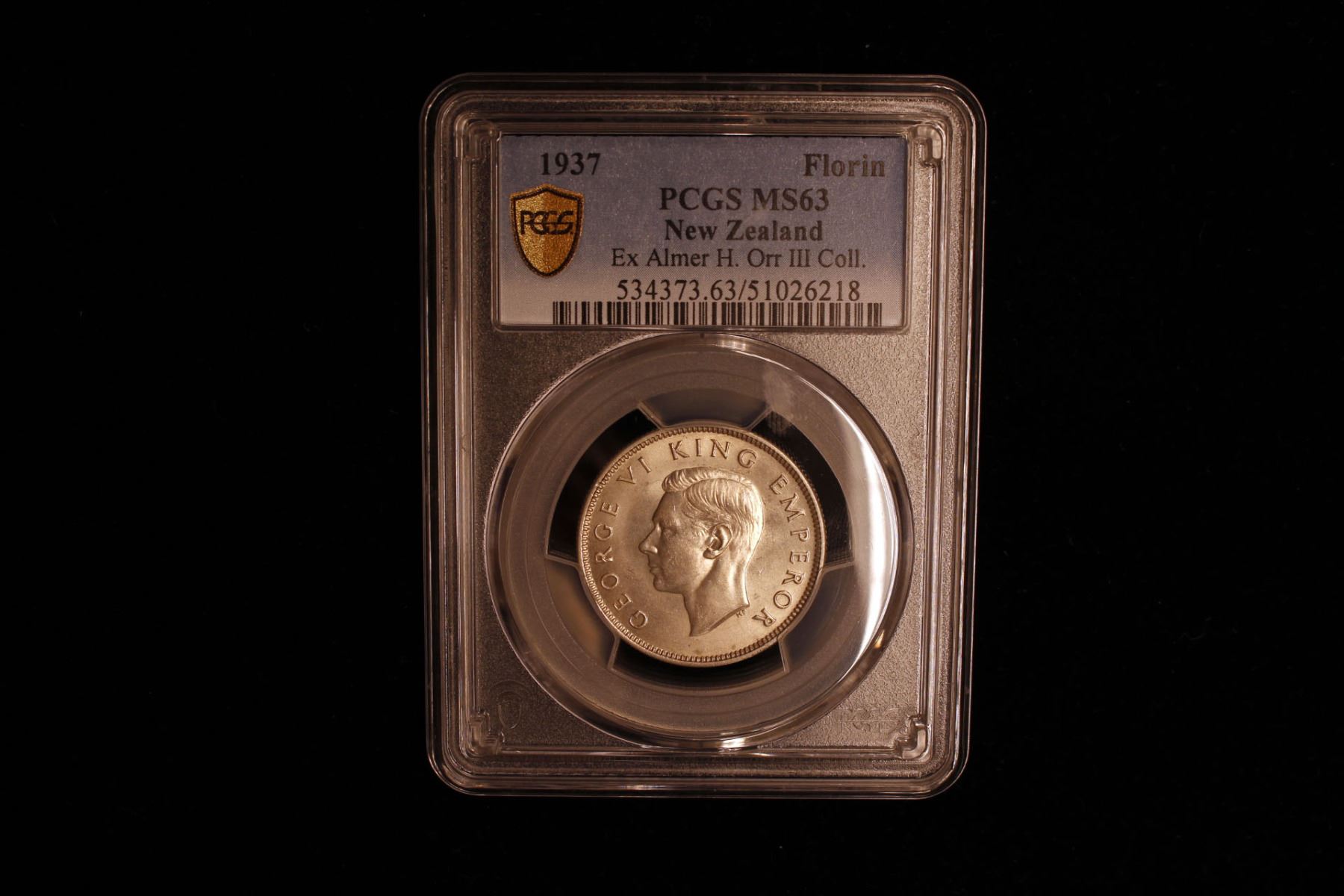 NEW ZEALAND: George VI, 1936-1952, AR florin, 1937, KM-10, a lovely example, PCGS graded MS63, ex Almer H. Orr III Collection.