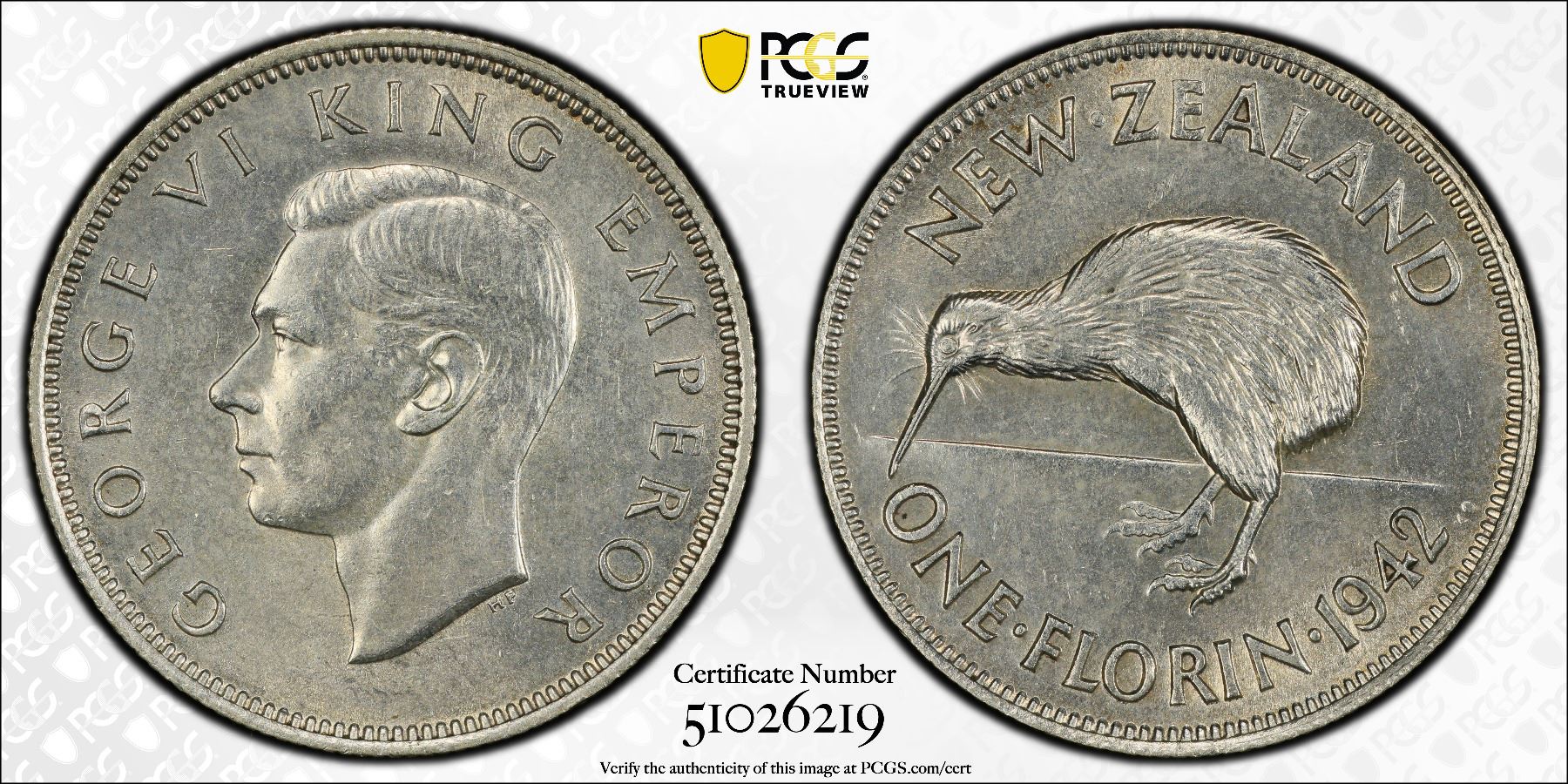 NEW ZEALAND: George VI, 1936-1952, AR florin, 1942, KM-10, once lightly cleaned and re-toned, PCGS graded Unc details, ex Almer H. Orr III Collection.