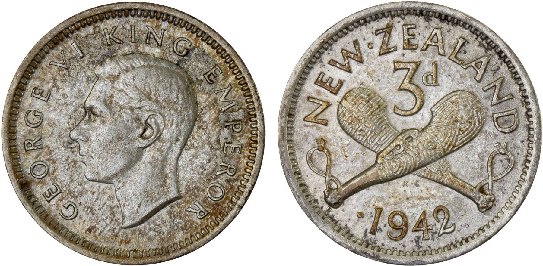 NEW ZEALAND: George VI, 1936-1952, AR threepence, 1942, AU