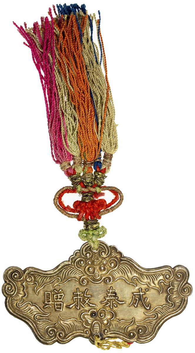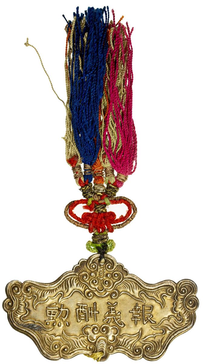 NGUYEN DYNASTY (ANNAM): Thanh Thai, 1889-1907, AV kim khánh medal (18.78g), Barac-77, cf. Sylvester-1/C/3/B, 76 x 41mm, Order of Kim Khánh Middle Class, made with two pieces of repoussé gold, thanh thai sac tang // bao nghia thu huan ("Bestowed by Thanh Thai // To reward righteousness & merit"), framed by floral decoration with curlicues at the top, bottom & corners, attached at top (sic) with knot & five multicolored tassels, and at bottom with cord, likely made by a goldsmith imitating the Chinese characters and worn upside-down by a recipient who can 't read them, AU, R, ex John Sylvester Jr. Collection. Khánh, which means a ceremonial gong of pleasing sound, was the most prestigious award during the Nguyen Dynasty. It comprised four classes (Great, First, Second, and Third) and was sparingly bestowed to officials of distinction, who could be seen in old photographs wearing them in the middle of their chest on important occasions. One example was even awarded to the President of France in 1875. Due to the hefty cost of production, the imperial court began issuing only a brevet in 1912, leaving the recipient to purchase their own medal. The French manufacturer M. Delande, for instance, priced the gilt silver first class kim khánh medal at 225 francs in his 1938 catalog. In 1957, the Order of Kim Khanh was resurrected under President Ngo Dinh Diem as the second-ranking civilian decoration, with a new design of a scholar 's scrolls.