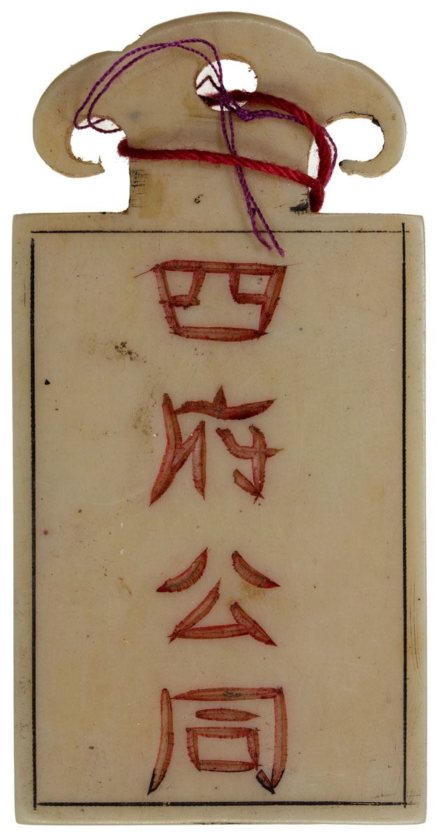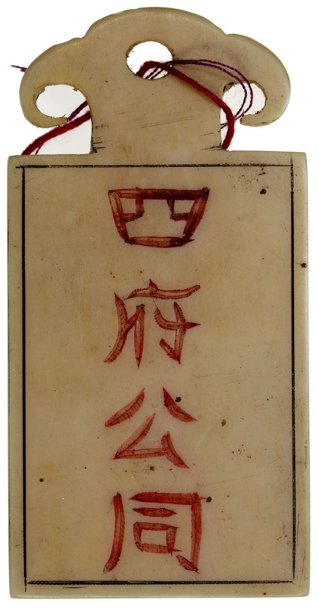 NGUYEN DYNASTY (ANNAM): religious amulet (13.36g), Sylvester—, 37 x 72 x 4mm, in the shape of a bài badge, made in bakelite or a similar material, tu phu cong dong ("Council of the Four Palaces") etched in red within rectangular border on both sides, attached with red cord on badge knob, EF, ex John Sylvester Jr. Collection. The Four Mother Goddesses are important deities in the traditional Vietnamese religion of Tu Phu ("Four Palaces") and its worship of Dao Mau, the supreme Mother Goddess. The Four Palaces refer to the four realms, i.e., Heaven, Mountains, Water, and Earth, each ruled by a Mother Goddess.